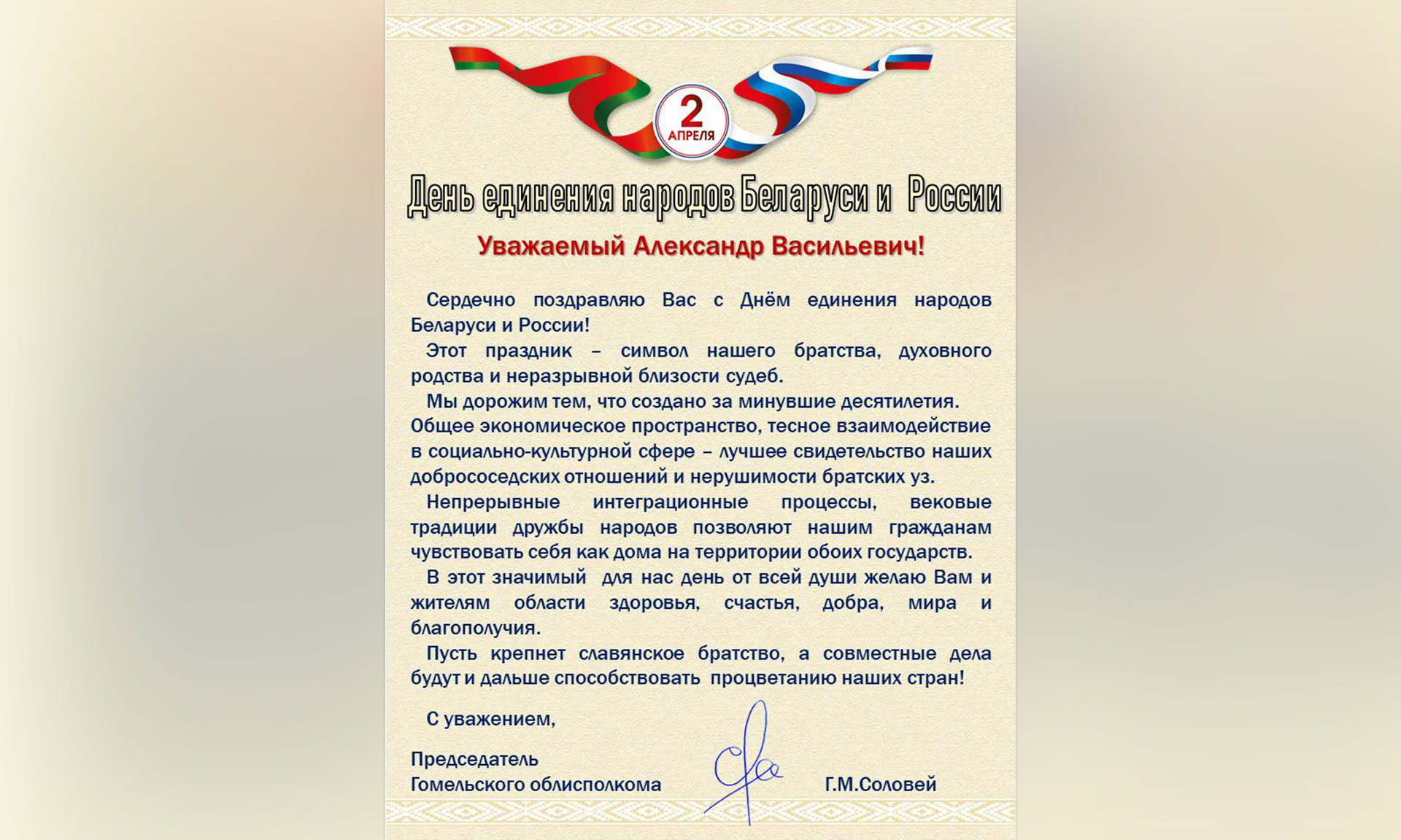 В адрес Губернатора Брянской области поступило поздравление от председателя Гомельского облисполкома Геннадия Соловья с Днем единения народов Беларуси и России. В поздравлении, в частности, говорится:
