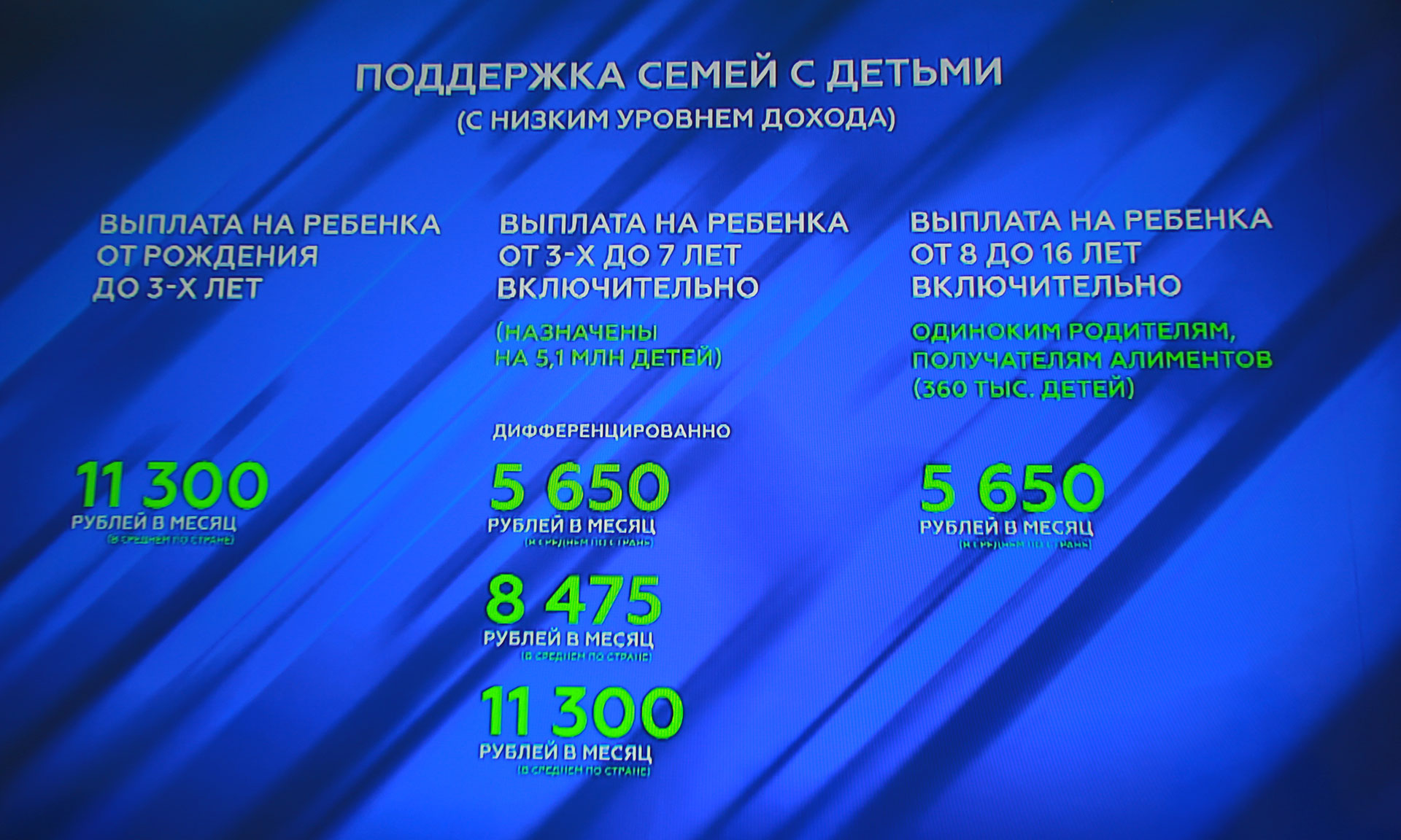 — Задача — свести к минимуму угрозу бедности для таких семей. Нужно отдельно поддержать те семьи, где мама или папа в одиночку воспитывает ребенка. И с 1 июля текущего года детям в возрасте от 8 до 16 лет, растущим в таких семьях, включительно будет назначена выплата, в среднем по стране ее размер составит более пяти тысяч рублей. Очень важно, чтобы поддержку со стороны государства чувствовали и будущие мамы.