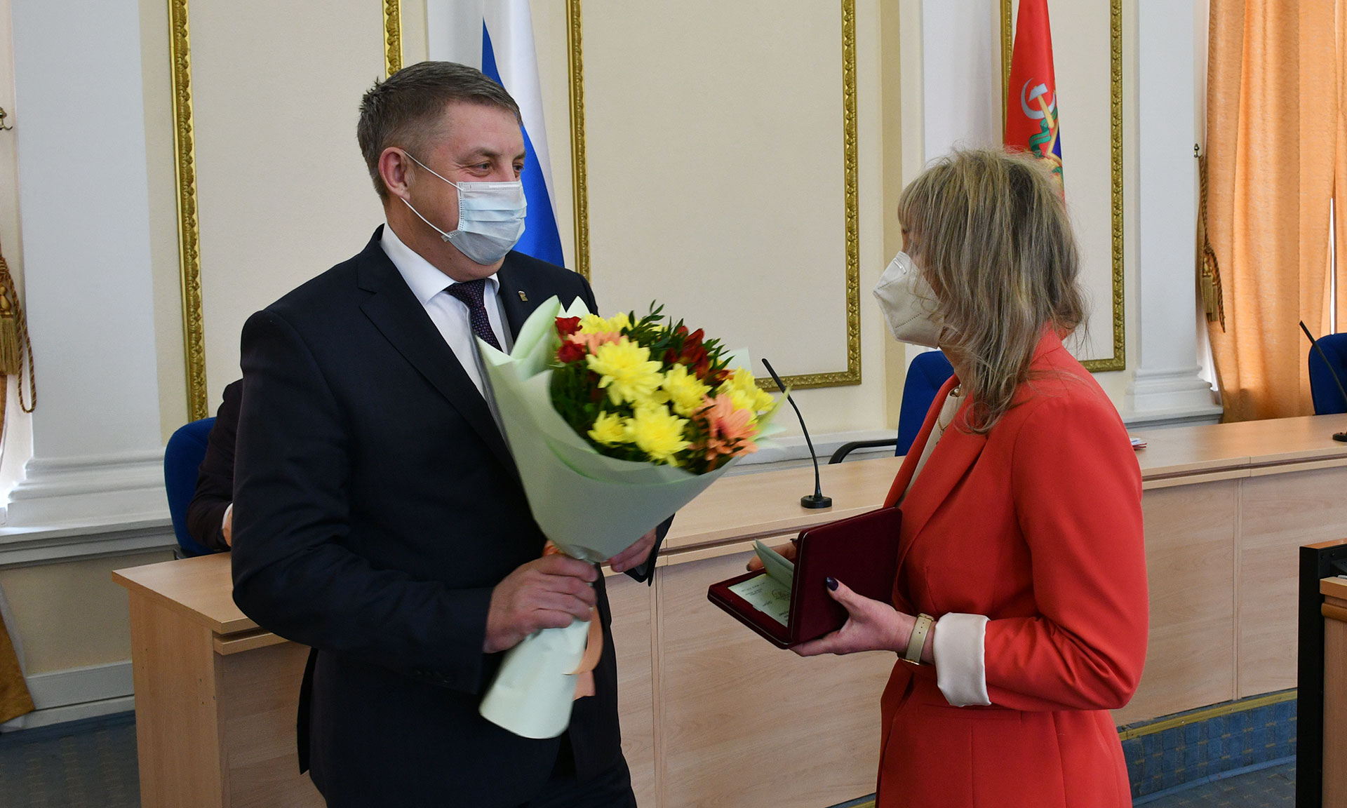 Перед обсуждением основной повестки состоялось вручение государственных наград. На высшем государственном уровне отмечены заслуги наших земляков. Указом Президента Российской Федерации от 3.08.2020 года № 493, за большой вклад в реализацию проекта по переходу Российской Федерации на цифровой формат телевещания почетное звание «Заслуженный работник связи и информации Российской Федерации» присвоено Ирине Малявко, директору филиала ФГУП РТРС «Брянский областной радиотелевизионный передающий центр». За личный вклад в реализацию данного проекта медалью ордена «За заслуги перед Отечеством II степени» награжден Геннадий Жариков, электромеханик Почепского подразделения Брянского ОРТПЦ. Указом Президента Российской Федерации от 15.03.2021 года № 142, за большой вклад в развитие отечественной культуры и искусства, многолетнюю, плодотворную деятельность медалью ордена «За заслуги перед Отечеством II степени» награжден Юрий Киселев, артист Брянского областного театра драмы им. А. К. Толстого.