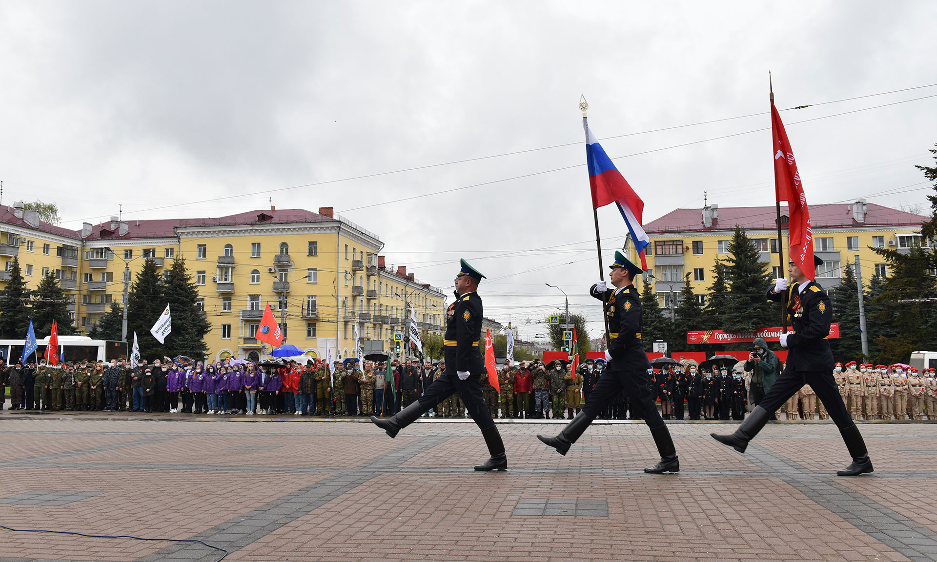 Под звуки «Марша Преображенского полка» в исполнении военного оркестра войск управления национальной гвардии России по Брянской области почетный караул пограничного управления ФСБ России по Брянской области внес копию знамени Победы и флаг Российской Федерации.