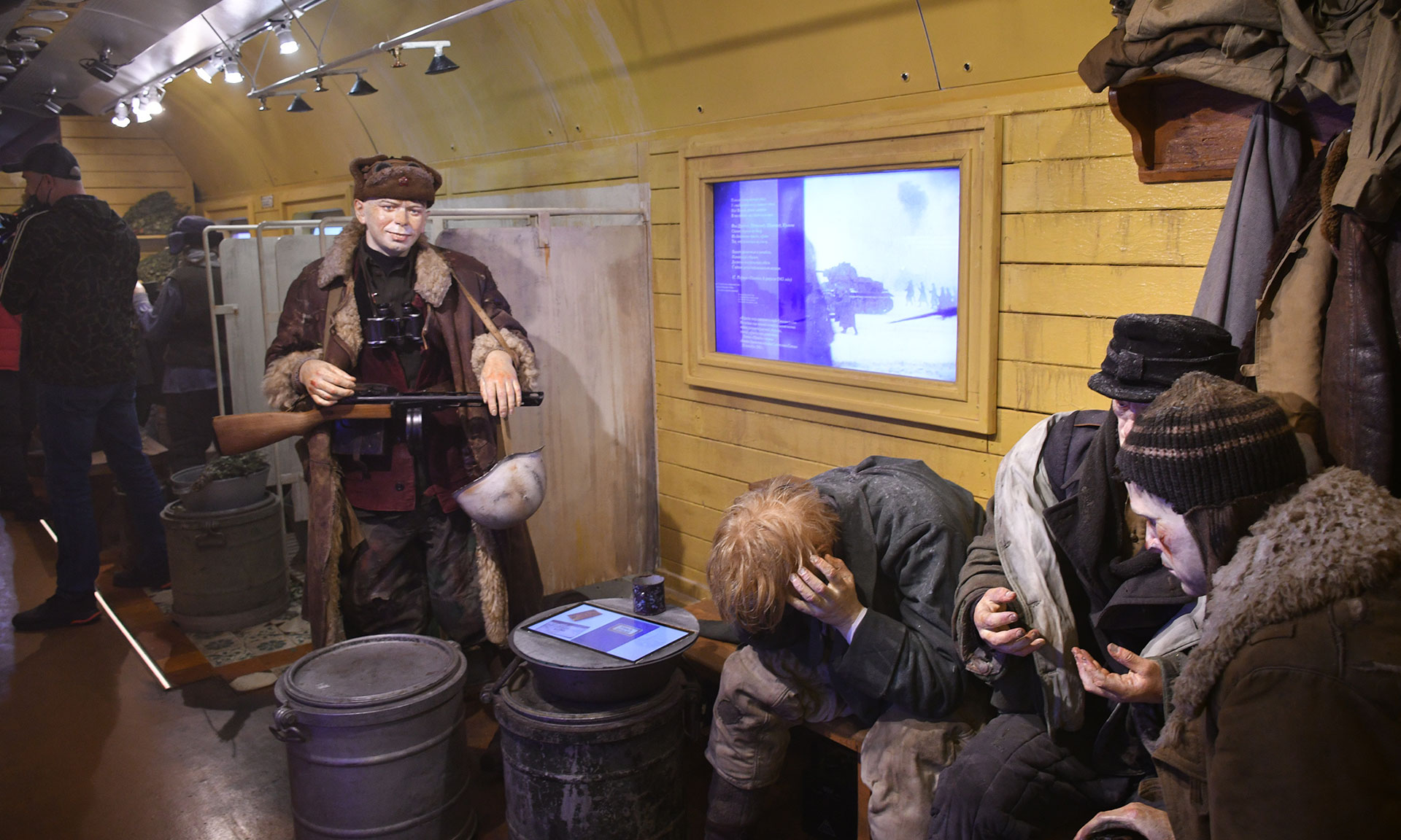 «Поезд Победы» — это первая в мире инсталляция, размещенная в движущемся составе поезда. На сегодняшний день ни в одном музее мира нет такого количества многофигурных композиций в скульптуре, как в «Поезде Победы». Выставочная экспозиция уникальна своим мультимедийным сопровождением. 50 видеопроекторов, 18 видеостен, 12 тач-столов, которые благодаря световым и звуковым эффектам воссоздают захватывающие воздушные бои и массированные танковые атаки, рисуют картины походной солдатской жизни, и тихие воспоминания мирного довоенного времени.