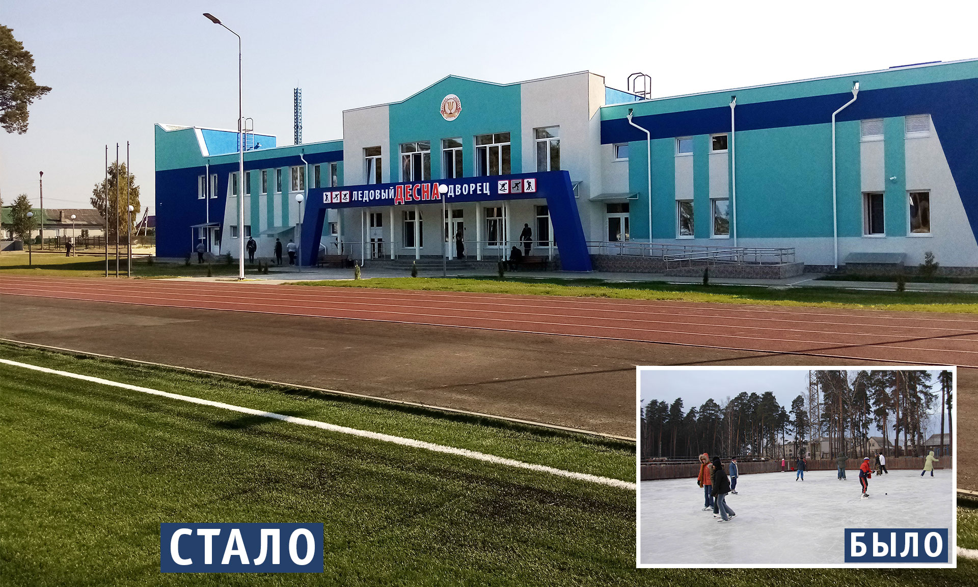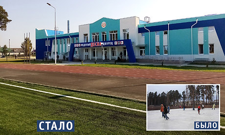 И сегодня здесь мы принимаем в эксплуатацию красавец ледовый дворец, современное футбольное поле с современными беговыми дорожками.