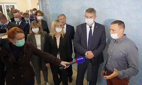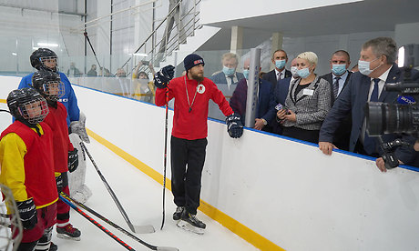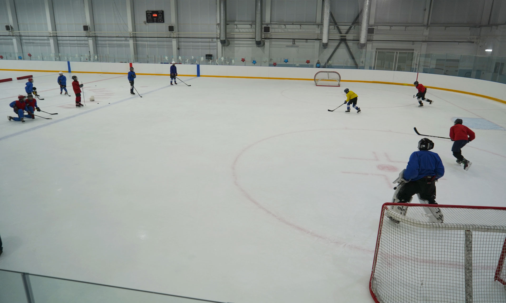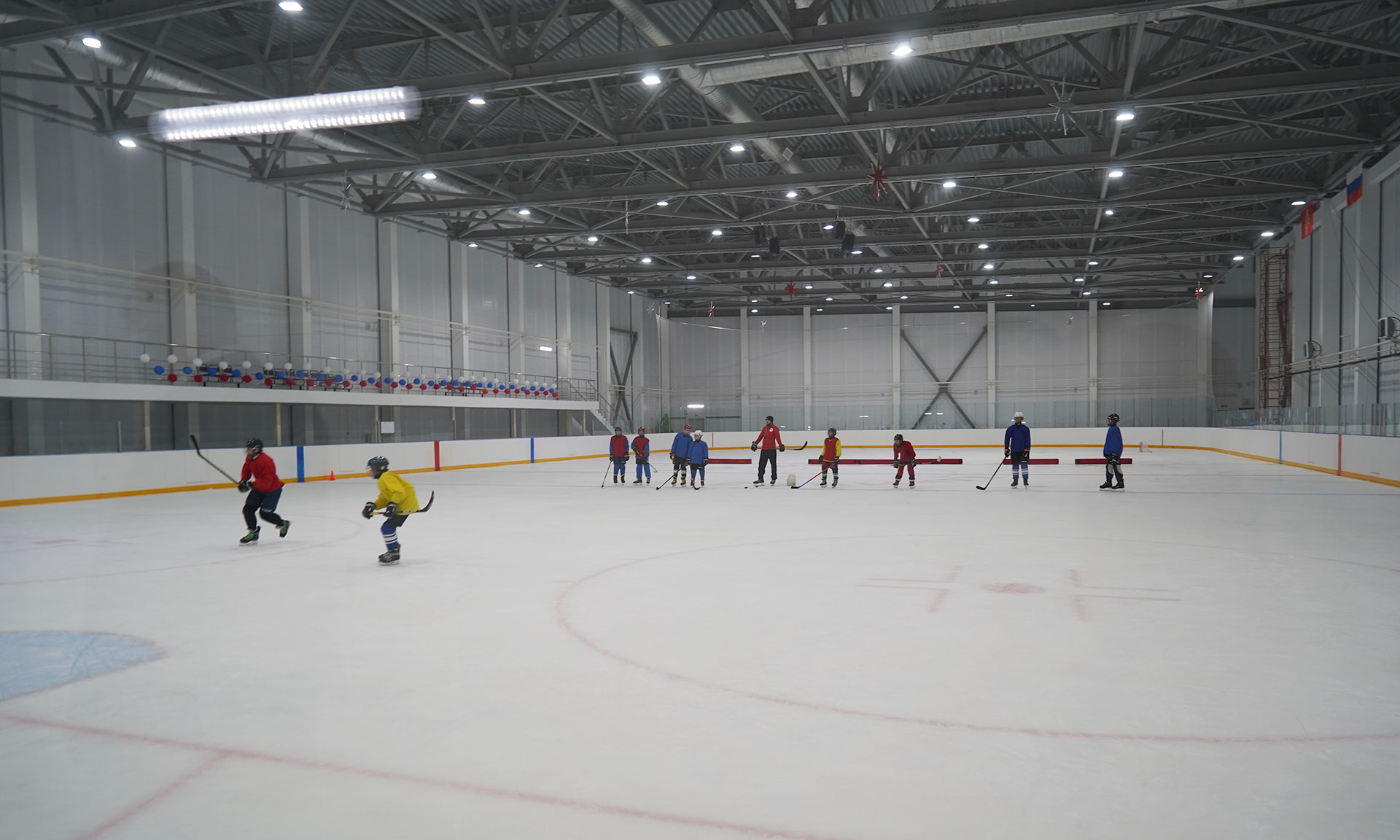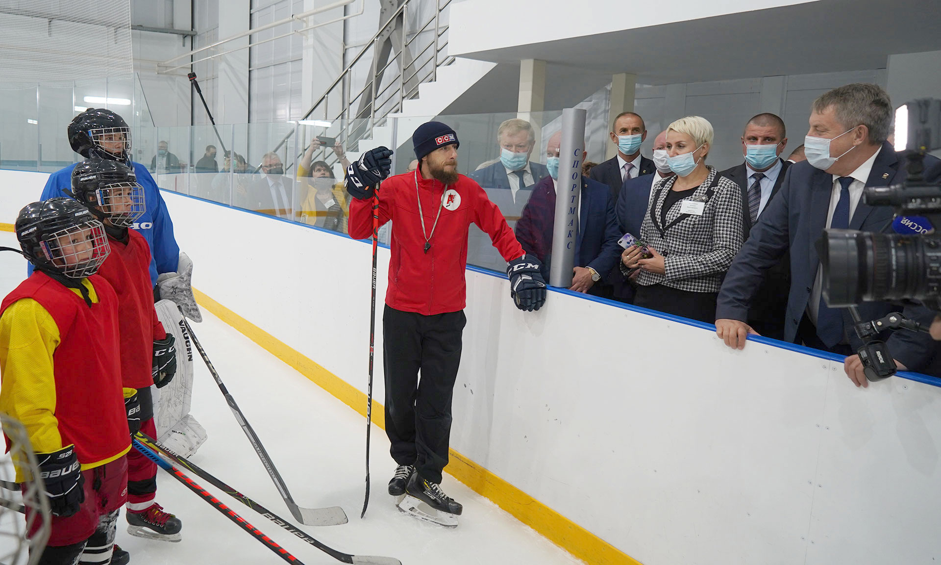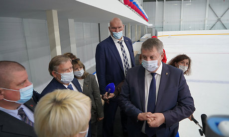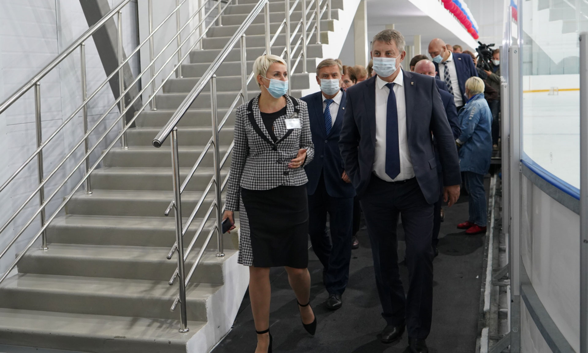 Руководители региона осмотрели спортивное сооружение — ледовую арену, раздевалки, тренажерный и гимнастический залы. На ледовой арене тренировались юные хоккеисты. Глава региона пообщался с юными спортсменами и их тренером.