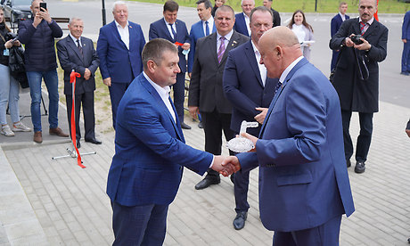 Символический ключ от нового спорткомплекса «Олимп» директору учреждения Максиму Олонцеву вручил Заслуженный и Почетный строитель России, генеральный директор группы компаний «Надежда» Александр Гавричков.