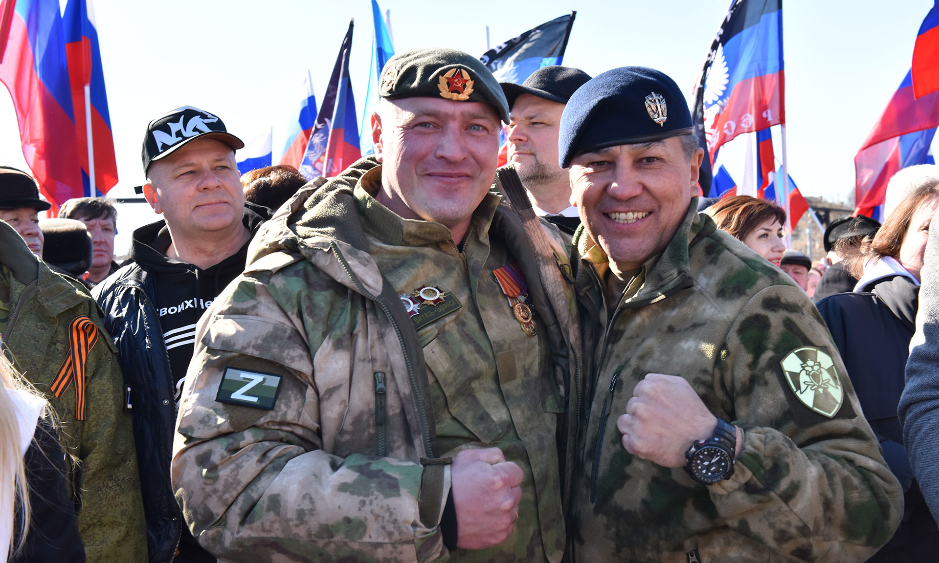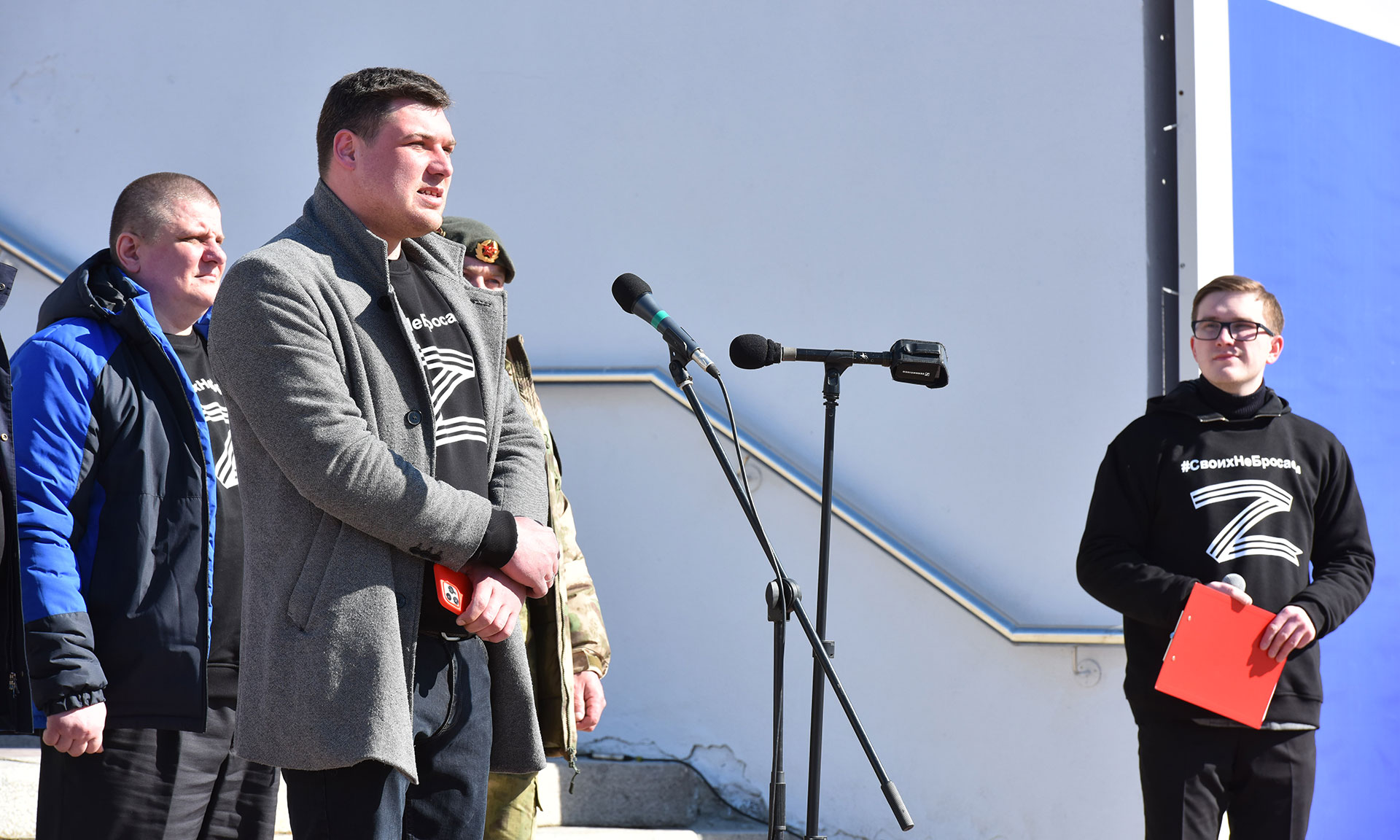 — Здравствуй, Россия! Мне очень приятно, что я вижу столько патриотов, которые поддерживают решение Президента не только о проведении спецоперации на Украине, но и о том, чтобы победить фашизм. Я очень рад видеть столько позитивных, красивых лиц, которые готовы подняться всем миром и показать, что мы сильны, мы едины! Нас никому не сломить, потому что мы — народ-победитель! Мы потомки победителей! За Россию! За Путина!