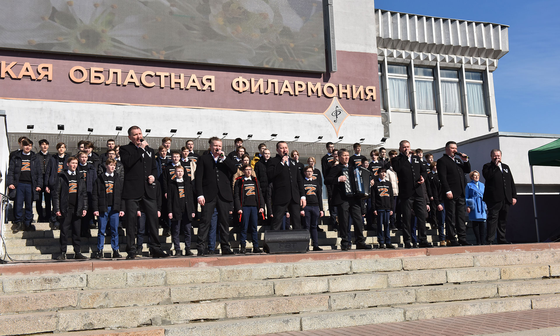 На площадке перед киноконцертным залом «Дружба» участники народного вокального ансамбля «Созвучие» ГДК Советского района, хор мальчиков Брянского городского лицея № 1 им. А. С. Пушкина исполнили песню Дениса Майданова «Флаг моего государства».
