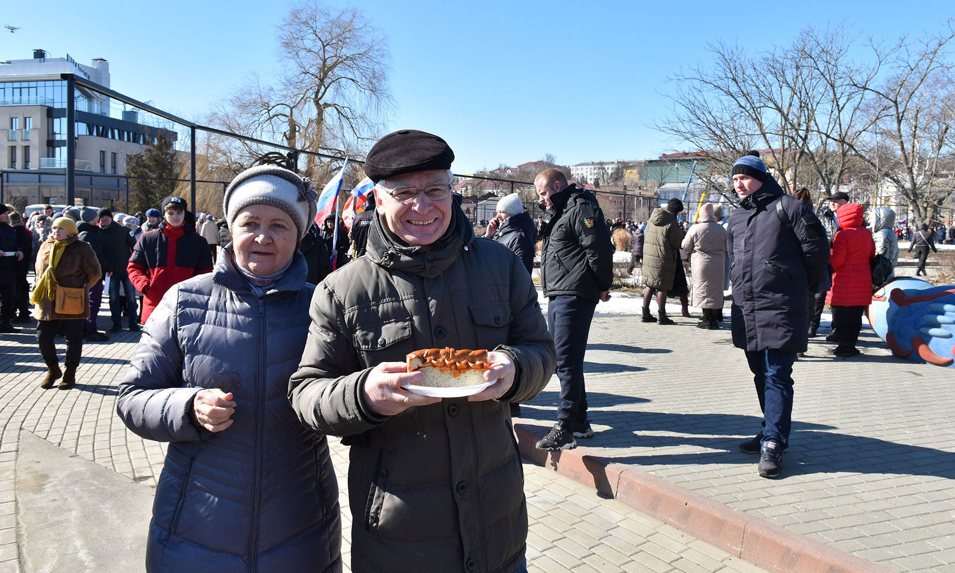 Как принято издавна на Руси, символом единения, стремления к миру и добру стал хлеб — огромный славянский каравай в этот день мог попробовать каждый, кто пришел на Славянскую площадь, чтобы сказать: «Я ZаМир! ZаРоссию! ZаПрезидента!», спеть всеми любимую «Катюшу».