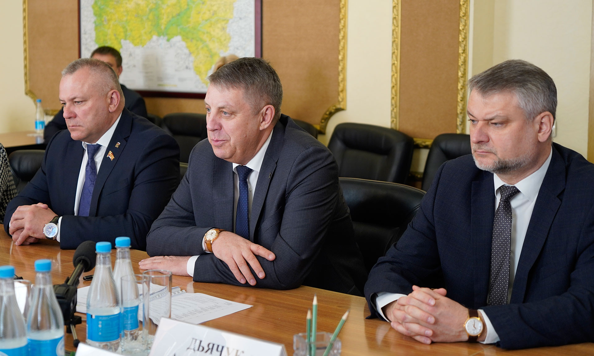 25 марта в Правительстве Брянской области состоялась рабочая встреча Губернатора Брянской области Александра Богомаза с делегацией Республики Беларусь, которую возглавляет председатель Гомельского облисполкома Иван Крупко.