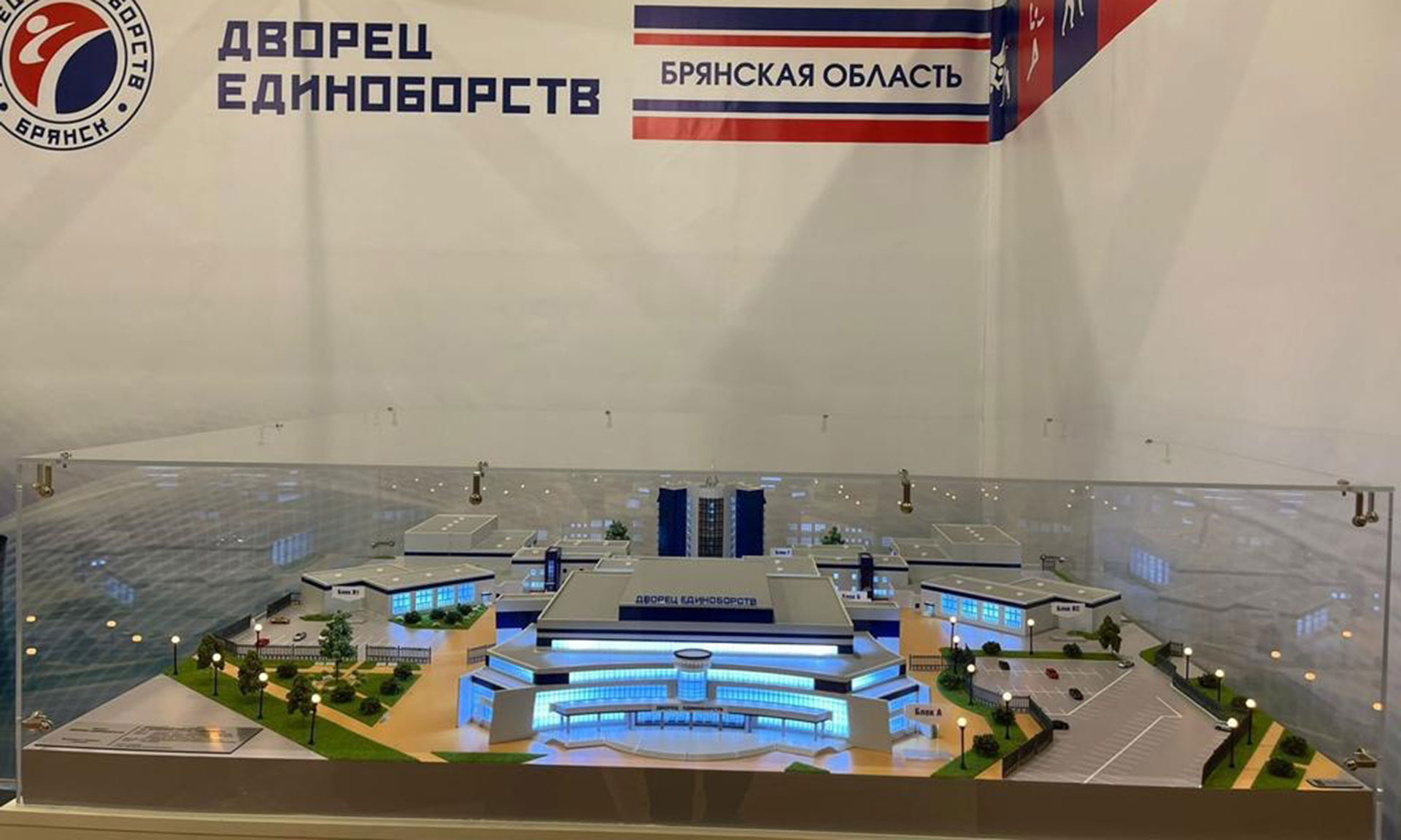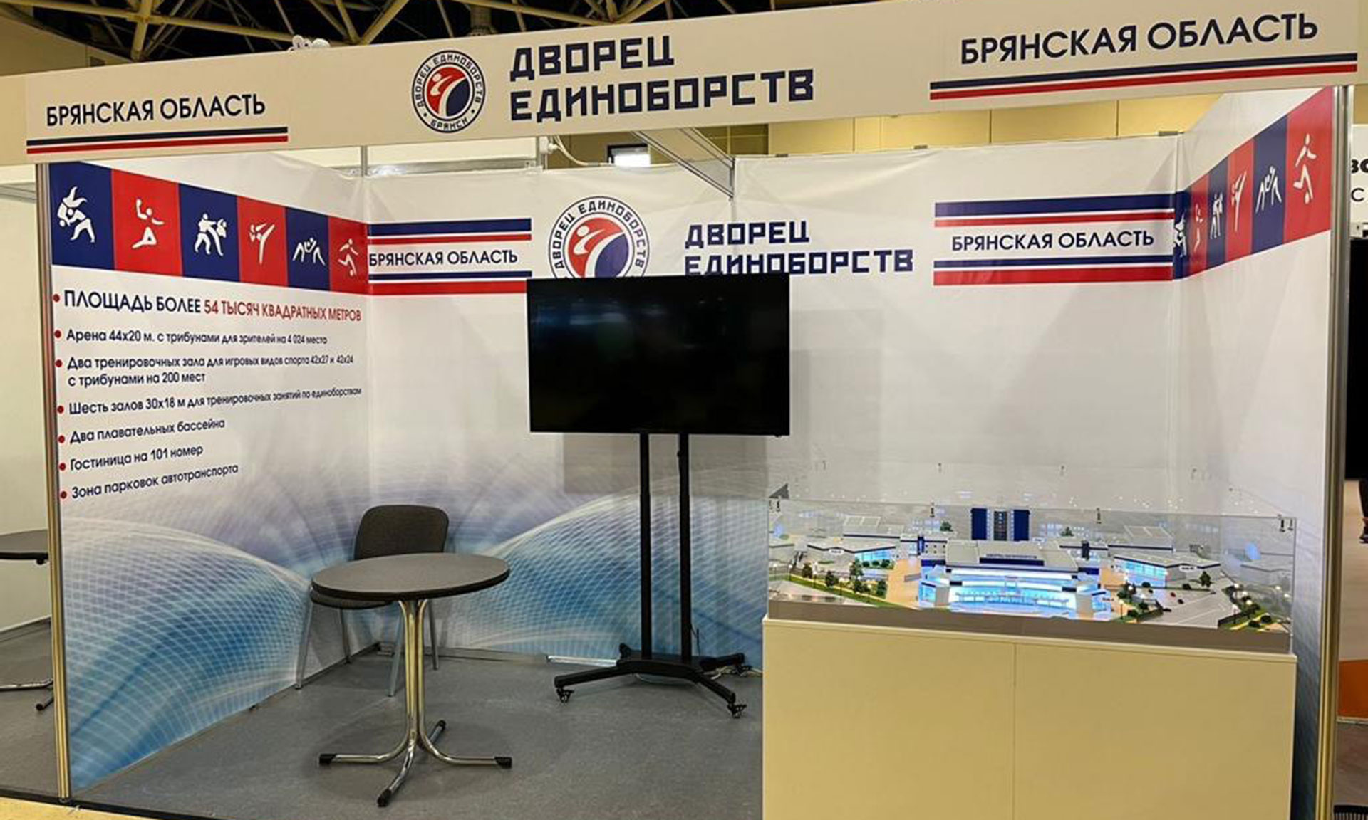 Вице-премьер также посетил экспозицию Брянской области, на которой представлен макет Дворца единоборств. Это одно из самых значимых спортивных сооружений в регионе, да и во всем Центральном федеральном округе. Стоимость его строительства превышает 2,2 млрд рублей. Это пять корпусов площадью в 55 тысяч кв. метров, главный зал на 4 тысячи зрителей, несколько залов для занятий различными видами спорта, ресторан, гостиница, реабилитационный центр для спортсменов, бассейн и другие объекты. Строительство объекта завершено. В настоящее время осуществляется приемка объекта контролирующими органами.