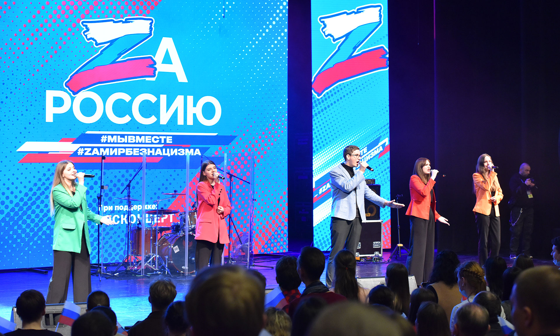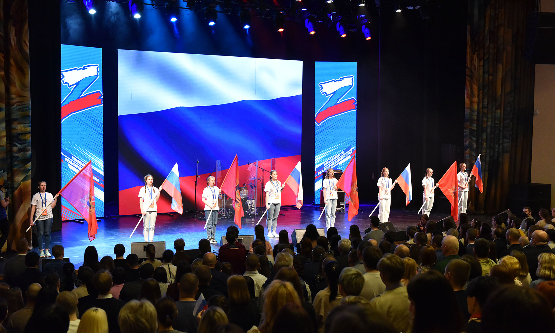 Перед началом концерта волонтеры культуры вынесли на сцену флаги Российской Федерации и Брянской области. Сегодня всем жителям России небезразлично то, что происходит во всем мире. Мы с гордостью смотрим на тех, кто выполняет свой долг, защищая наших соотечественников. Началась музыкальная программа с исполнения гимна Российской Федерации.