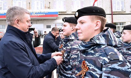 В память о Великой Победе и обо всех тех, кто подарил ее нам, с чувством гордости за историю своей страны георгиевскую ленточку почетным гостям прикрепили отличники Брянской кадетской школы имени Героя России В. И. Шкурного. В свою очередь руководители региона прикрепили георгиевские ленточки учащимся кадетской школы.