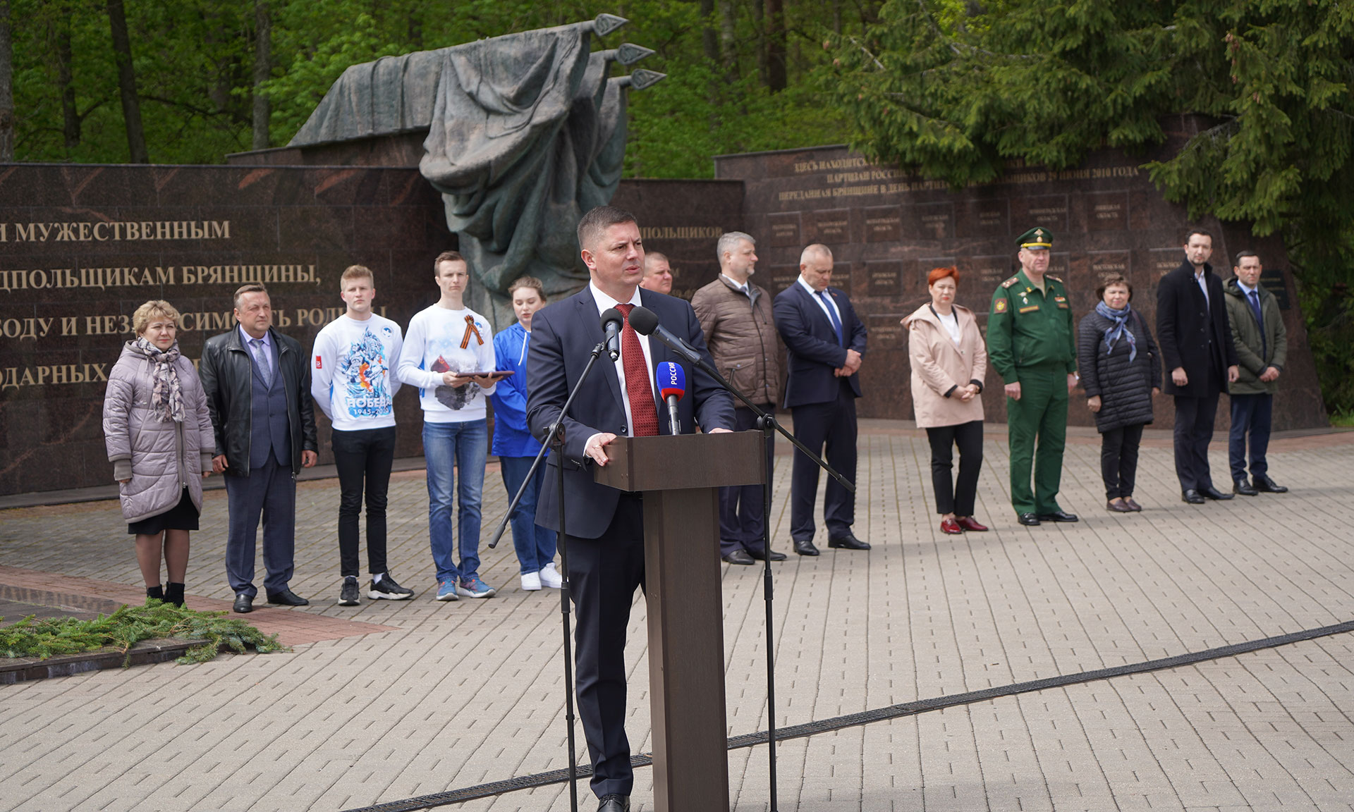 — Уважаемые участники митинга, я хочу выразить слова особой благодарности нашим коллегам из Курска, которые передали Брянской земле частичку своей истории. Это, прежде всего и внимание, и память, важное отношение к символам Победы. Символично, что передача знамени происходит здесь, на этом святом для нас месте — Партизанской поляне.