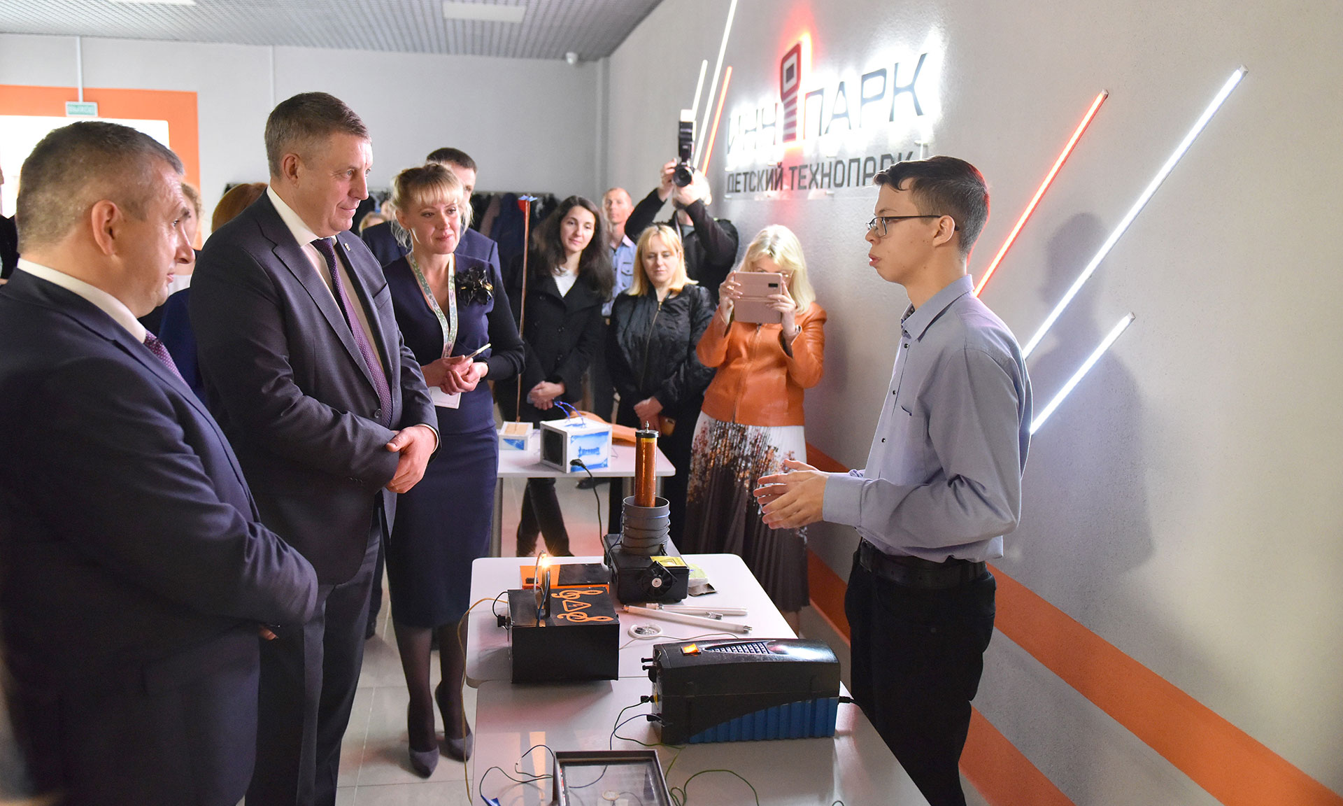 В Гомельском детском технопарке, работающем на базе «Коралла», сегодня занимаются более 900 детей в возрасте от 5 до 17 лет по таким инновационным направлениям, как ИТ, робототехника, электроника, 3D- моделирование. Воспитанники центра продемонстрировали свои действующие проекты, в том числе сельхозяйственного направления — инкубатор, весы пасечника, беспилотник для орошения полей, робот-переводчик и робот для настольного тенниса, показали опыты с электричеством и звуком.