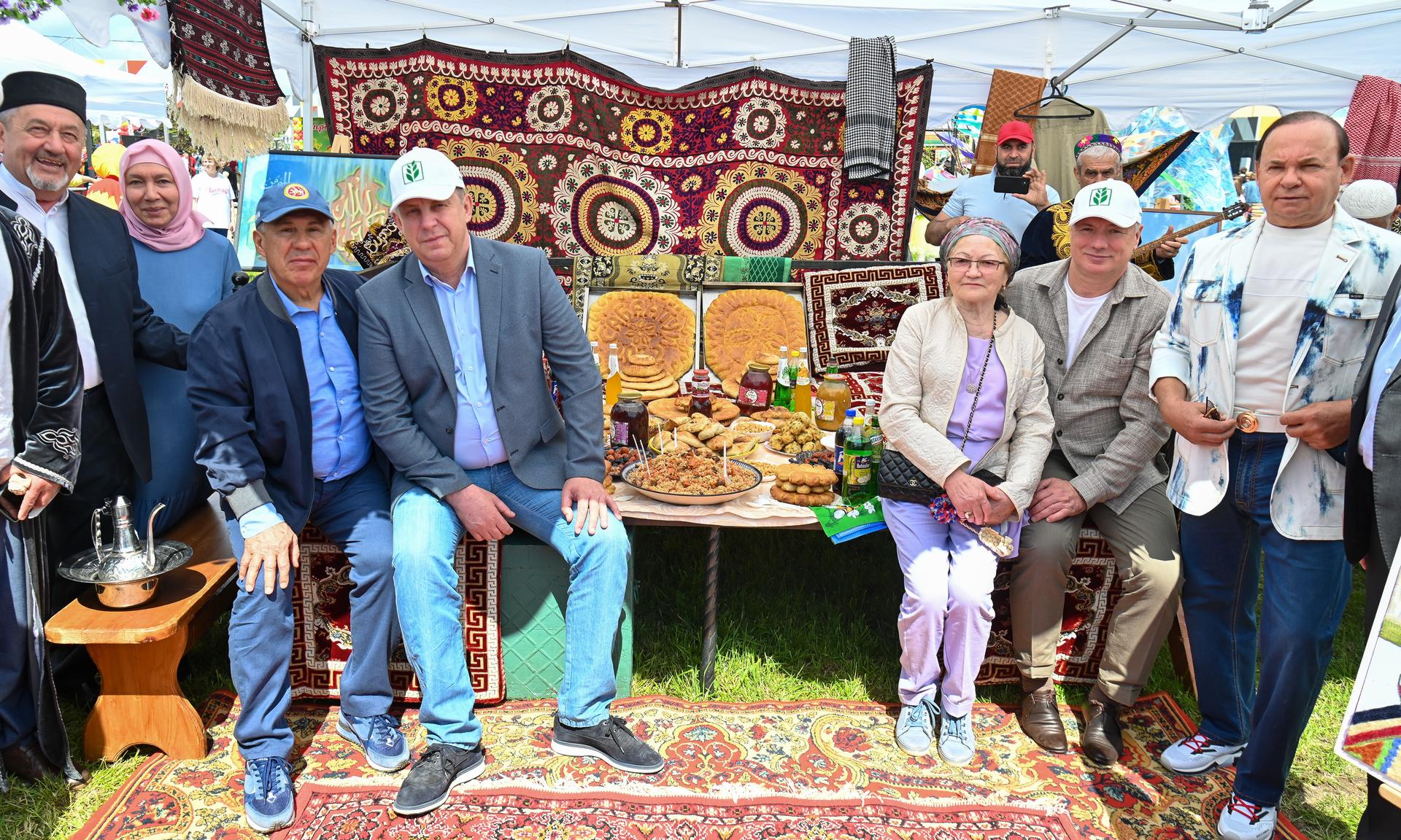 Рустам Минниханов, Марат Хуснуллин и Александр Богомаз в рамках Сабантуя посетили национальные подворья: татарское, русское, чувашское, кряшенское подворье, «восточный базар». Гости также осмотрели площадку интерактивных игр.