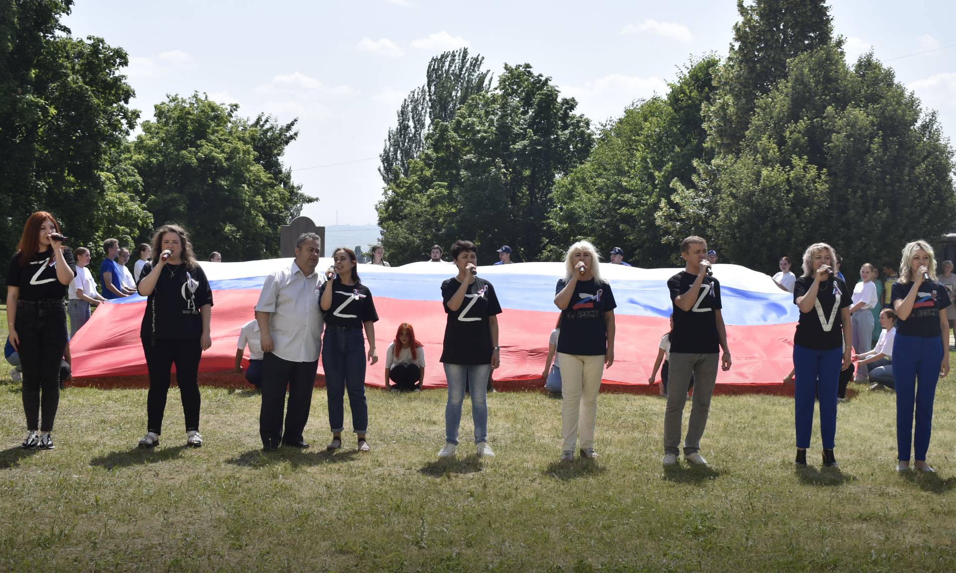 В День России жители прифронтового города Брянки, жены и дети защитников Луганской Народной Республики собрались в центре города и исполнили гимн Российской Федерации.