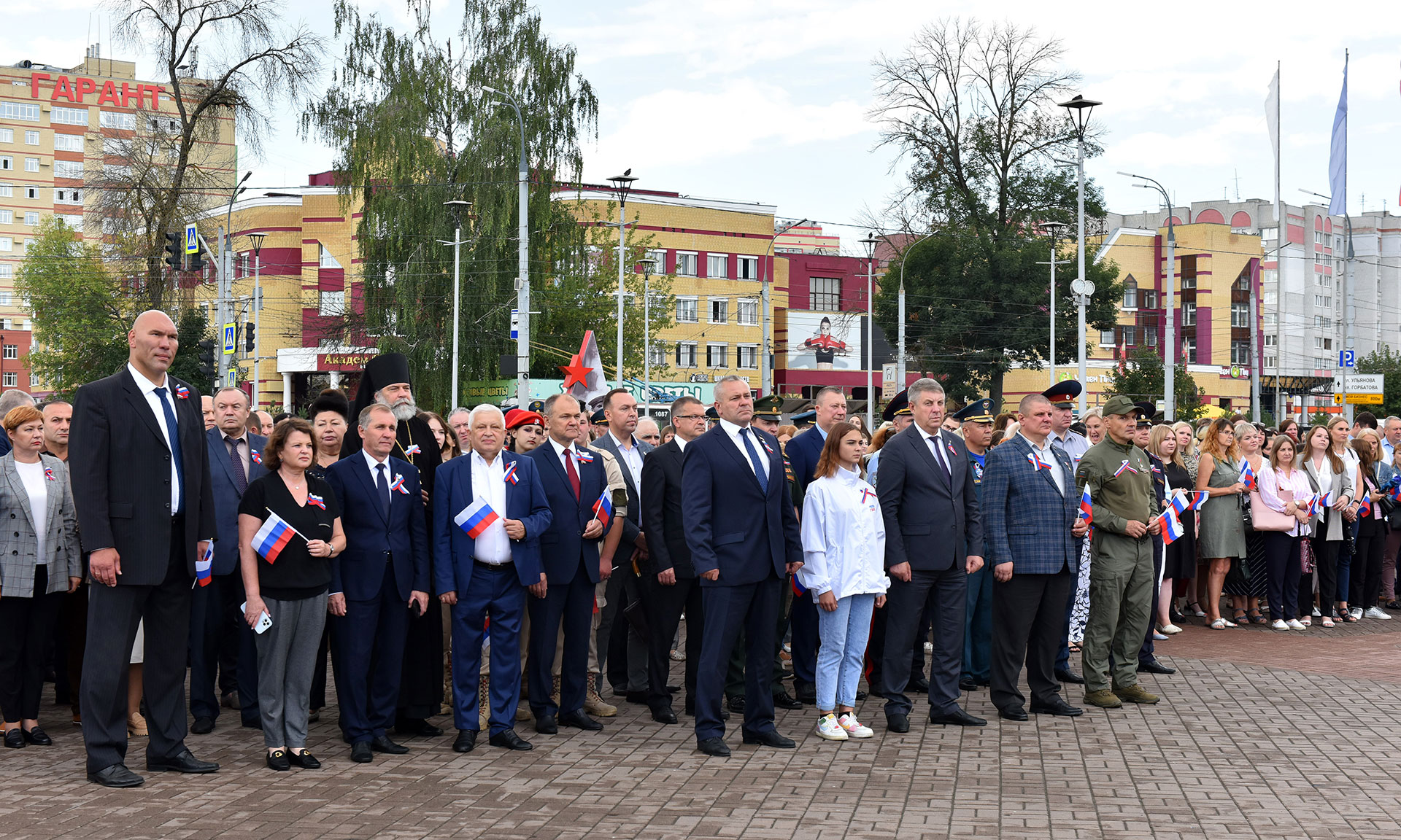 В торжественном мероприятии на площади Воинской Славы приняли участие Губернатор Брянской области Александр Богомаз, председатель Брянской областной Думы Валентин Суббот, иеромонах Корнилий (Недбаевский), Герой Российской Федерации Александр Постоялко, Герой Российской Федерации Андрей Фроленков, первый заместитель председателя Комитета Государственной Думы по туризму и развитию туристической инфраструктуры Николай Валуев, депутат Государственной Думы Федерального Собрания Российской Федерации Николай Щеглов, председатель Брянского областного суда Александр Курганов, начальник УФСБ России по Брянской области Николай Рудь, начальник УМВД России по Брянской области Владислав Толкунов, начальник ГУ МЧС России по Брянской области Вадим Уваркин, заместитель начальника Управления — начальник центра лицензионно-разрешительной работы управления Федеральной службы войск национальной гвардии по Брянской области Андрей Борисов, начальник УФСИН России по Брянской области Сергей Герасимов, военный комиссар Брянской области Марат Урмансов, заместители Губернатора Брянской области, заместители председателя Брянской областной Думы, глава города Брянска Марина Дбар, глава Брянской городской администрации Александр Макаров, руководители исполнительных органов государственной власти Брянской области, коллективы судебной системы, прокуратуры и правоохранительных органов Брянской области, гости и жители города Брянска.