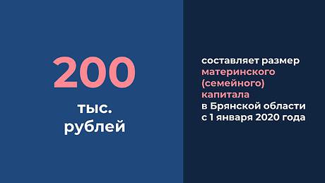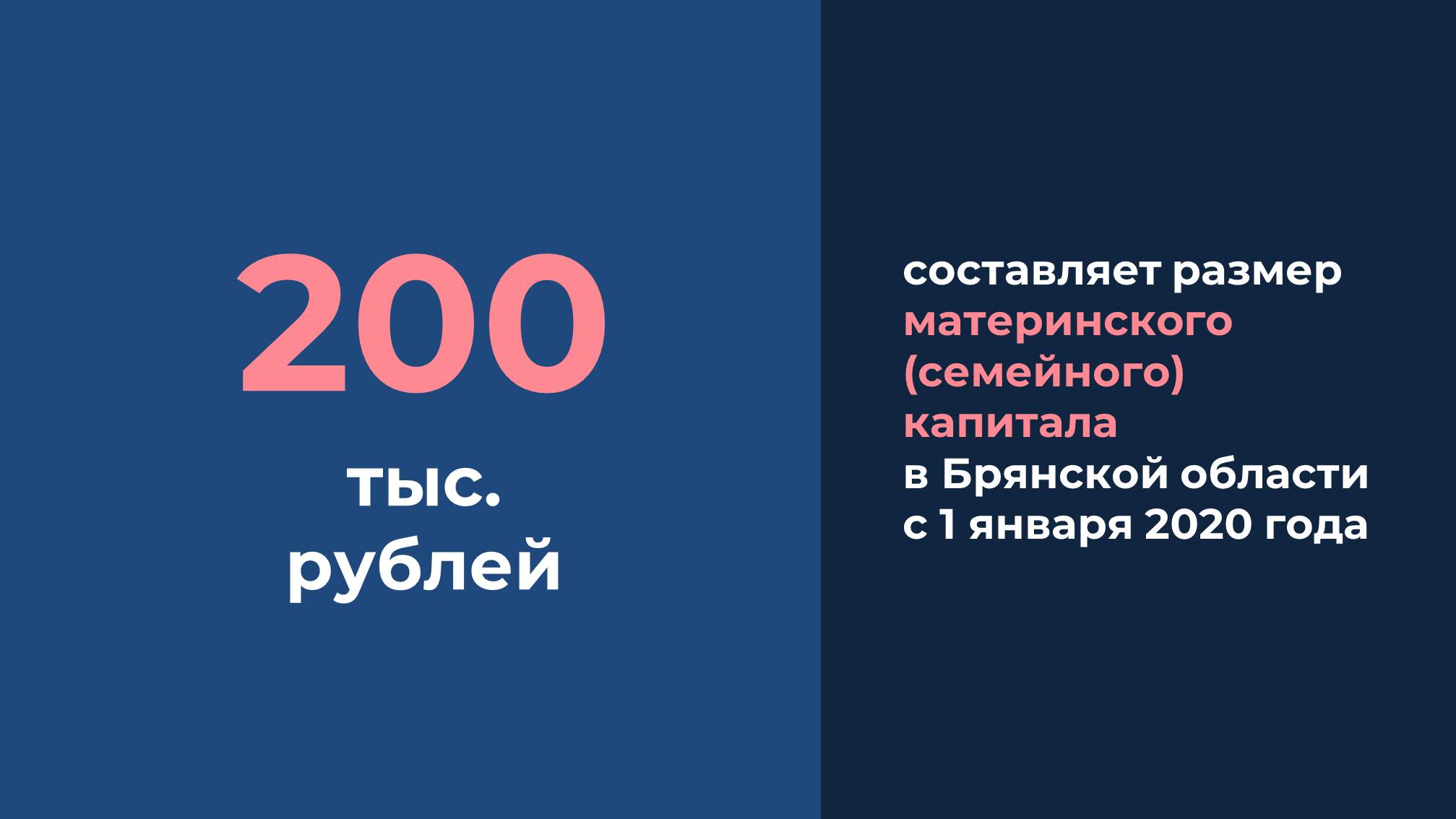 Размер материнского (семейного) капитала в Брянской области с 1 января 2020 года составляет 200 тыс. рублей. В семьях, в которых одновременно рождается двое детей (при условии, что один из рожденных детей — третий по числу рожденных матерью), размер областного материнского (семейного) капитала удваивается и составляет 400 тыс. рублей, а при рождении одновременно трех и более детей размер областного материнского (семейного) капитала составляет 1 млн 200 тыс. рублей. Количество семей, распорядившихся средствами областного материнского (семейного) капитала за 9 месяцев 2022 года составило 876 семей.