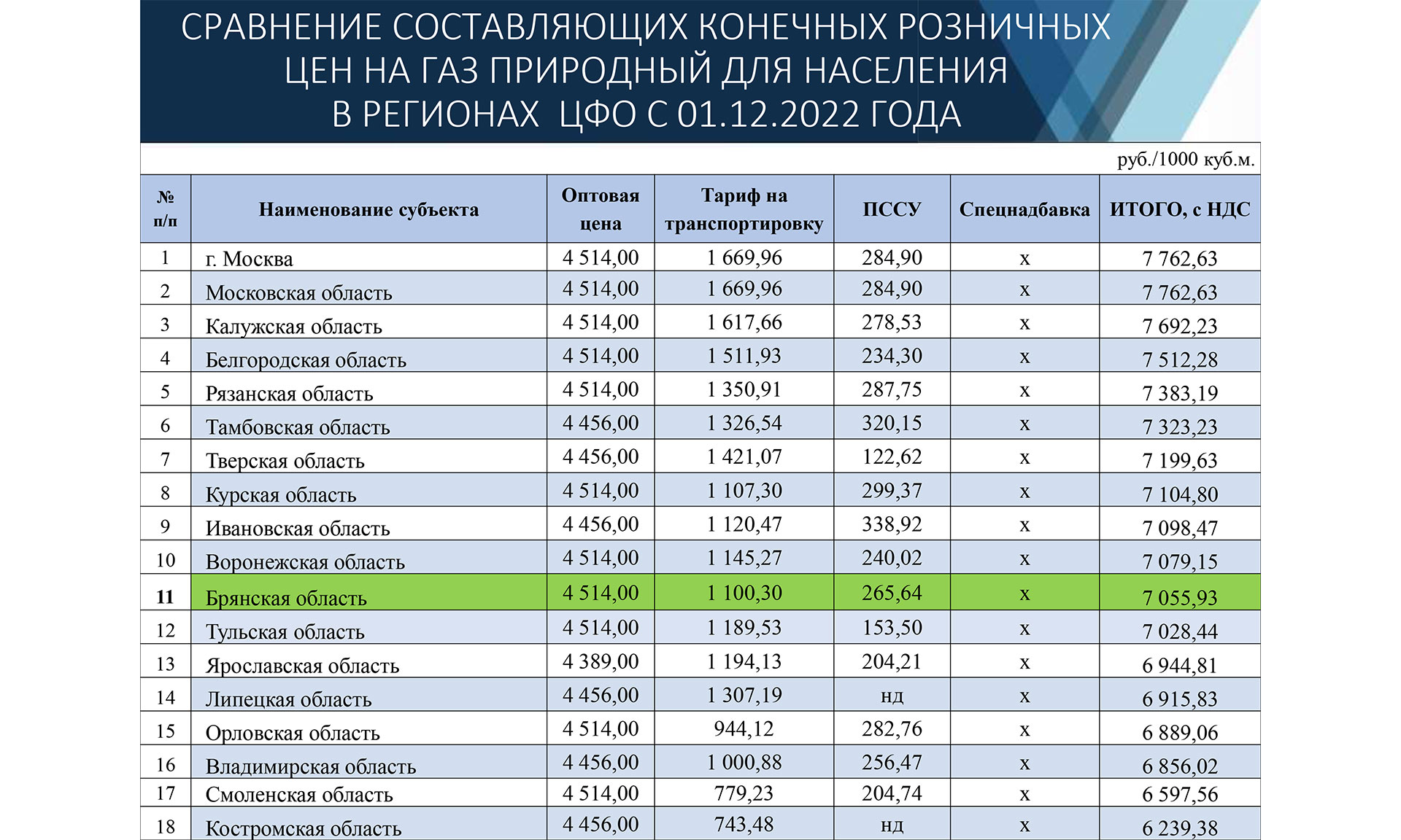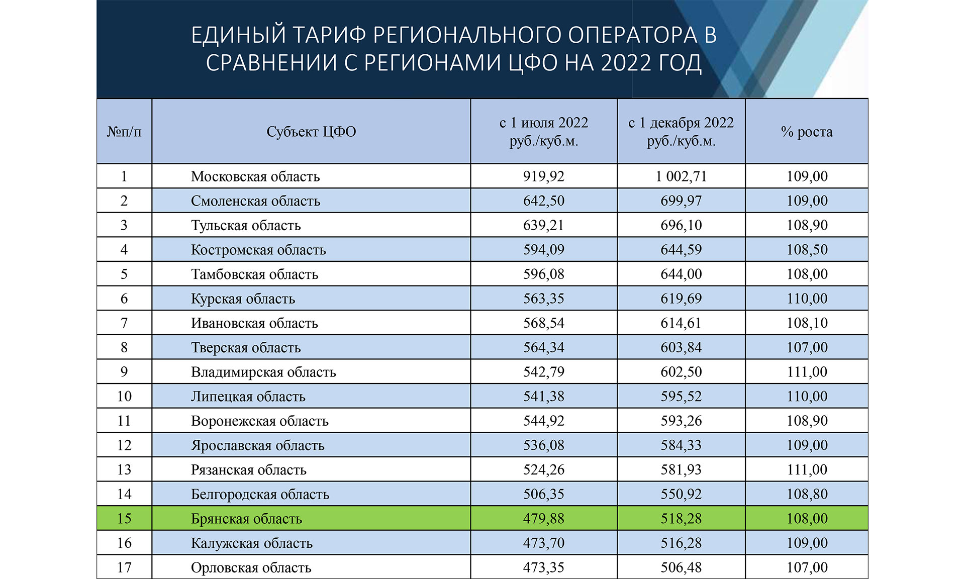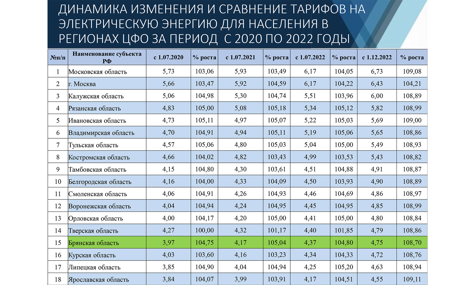 Так, по уровню тарифа на электроэнергию Брянская область находится на 15 месте из 18, одни из самых высоких тарифов в Калужской, Рязанской, Ивановской, Владимирской, Тульской областях. На 15-м месте Брянская область и по единому тарифу регионального оператора по вывозу твердых коммунальных отходов, в числе регионов с самыми высокими ценами — Смоленская, Тульская, Костромская, Тамбовская, Курская области. Цена на природный газ для населения в Брянской области также одна из самых низких — регион на 11 месте.