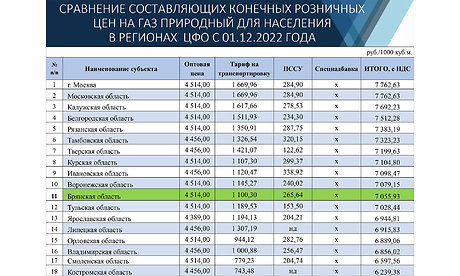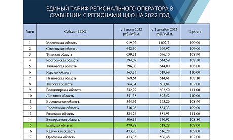Постановлением Правительства РФ от 14.11.2022 № 2053 индексация тарифов на коммунальные услуги перенесена с 1 июля 2023 года на 1 декабря 2022 года. В соответствии с принятым решением с 1 декабря 2022 года в Брянской области, как и во всех субъектах РФ, произошло изменение тарифов на коммунальные услуги. По данным мониторинга тарифы на электрическую энергию, газ и вывоз ТКО для населения Брянской области остается одними из самых низких среди регионов Центрального федерального округа.