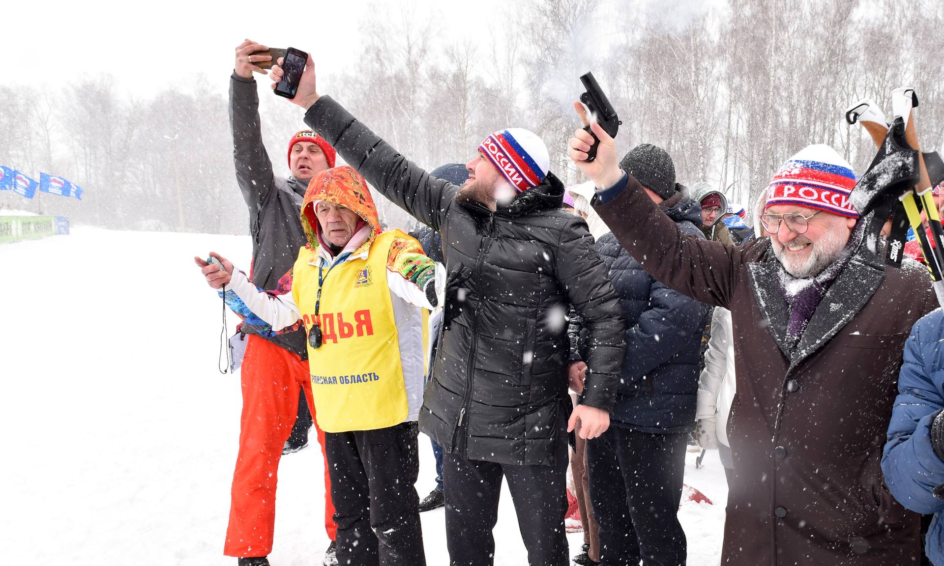 После официальных приветствий участники забега направились к старту гонки. Губернатор Александр Богомаз и почетный гость Президент Академии наук Чеченской Республики Джамбулат Умаров символическими выстрелами из стартового пистолета дали старт лыжной гонке.