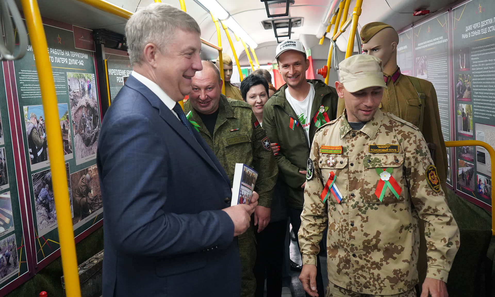 Перед началом торжественного собрания Губернатор Александр Богомаз ознакомился с экспозицией, которую подготовила могилевская делегация в рамках проекта «Дорогами памяти и славы». Ребята собрали в передвижной выставке предметы времен Великой Отечественной войны: фронтовые письма, фотокарточки солдат с историями и биографиями героев, артефакты, найденные во время поисковых работ и многое другое.