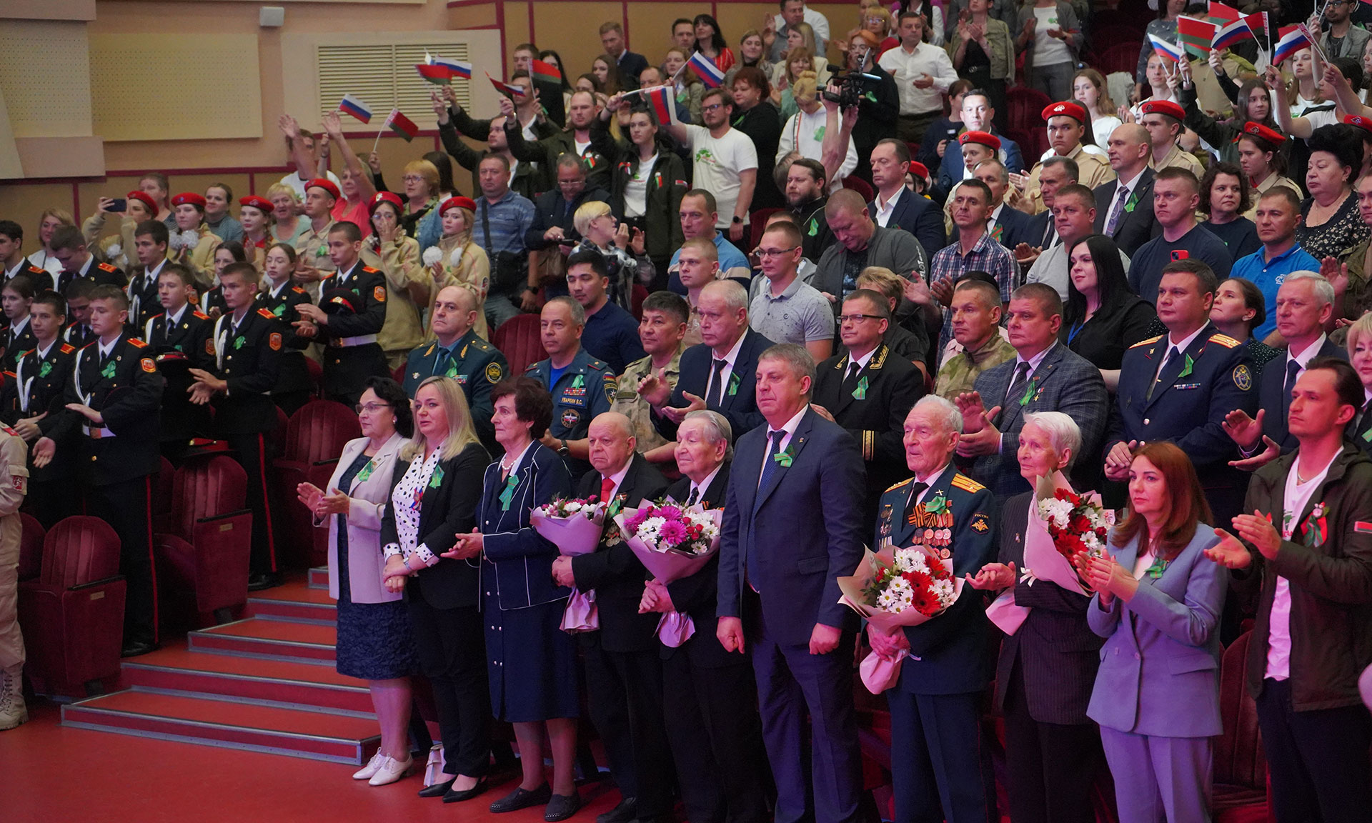 В торжественном мероприятии приняли участие Губернатор Брянской области Александр Богомаз, Герои Российской Федерации Александр Постоялко и Андрей Фроленков, сенатор Российской Федерации Галина Солодун, член Общественной палаты Российской Федерации Лидия Ермакова, председатель регионального отделения «Комитет семей воинов Отечества» в Брянской области Марина Седнева, Герой труда Брянской области Михаил Кабанов, первый секретарь Могилевского областного комитета общественного объединения Белорусского Республиканского Союза Молодежи Александр Саксонов, руководители судебных органов Брянской области, прокуратуры, правоохранительных органов и силовых структур Брянской области, заместители Губернатора Брянской области, заместители председателя Брянской областной Думы, депутаты Брянской областной Думы, руководители города Брянска, представители Брянской епархии, руководители общественных организаций, делегация молодежного патриотического проекта «Дорогами Памяти и Славы», представители трудовых коллективов, ветераны Вооружённых сил, участники специальной военной операции, члены семей погибших защитников Отечества, представители студенчества, общественные организаций, курсанты, кадеты, члены военно-патриотических клубов.