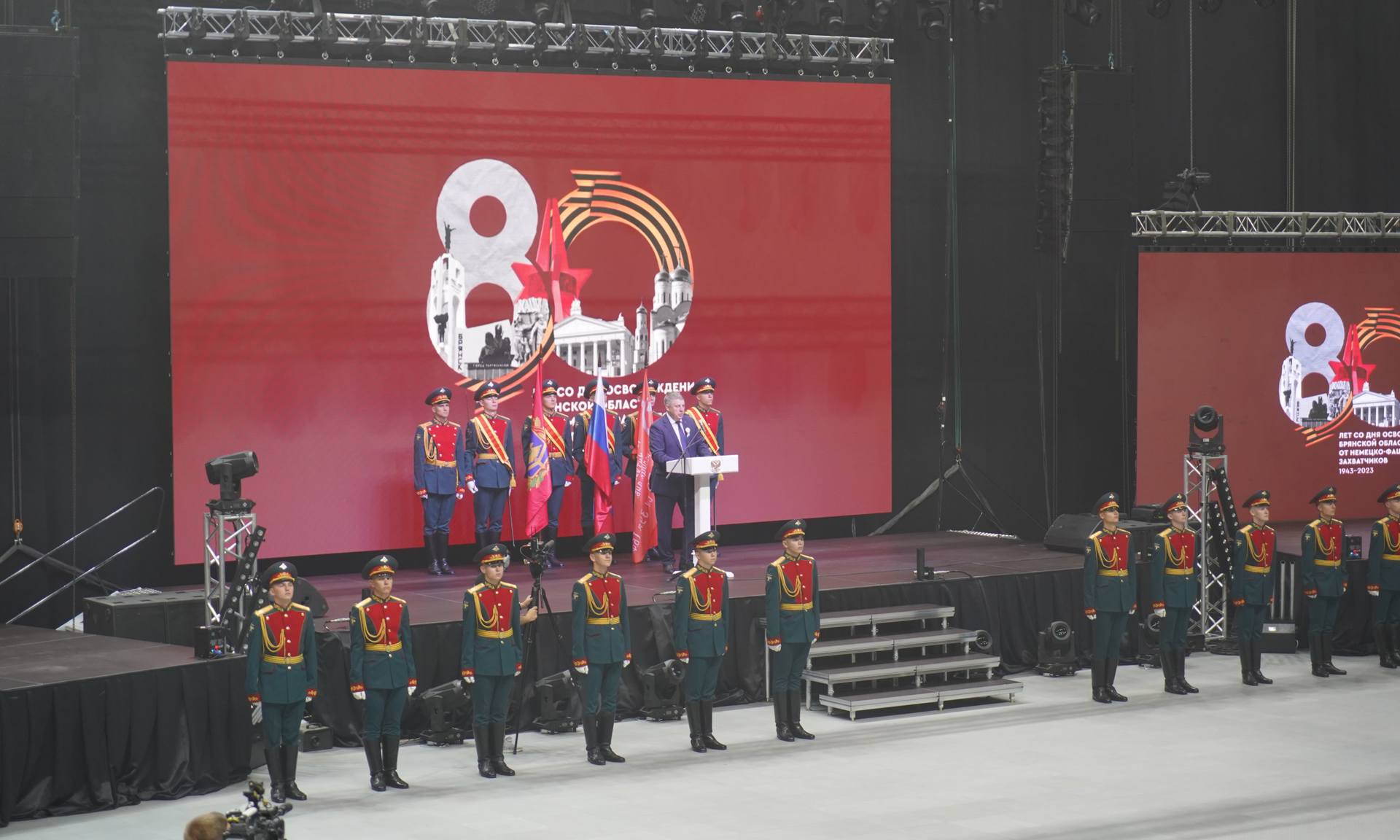 — Дорогие ветераны, труженики тыла! Уважаемые гости и дорогие земляки! Поздравляю вас с 80-й годовщиной освобождения нашего легендарного и героического Брянского края и города Брянска от немецко-фашистских захватчиков! Проходят годы, сменяются поколения, но этот день всегда будет почитаем и уважаем нашим народом! Потому что это день — этот день мужества и чести, отваги и подвига, доблести и славы. Это день памяти и скорби.