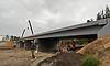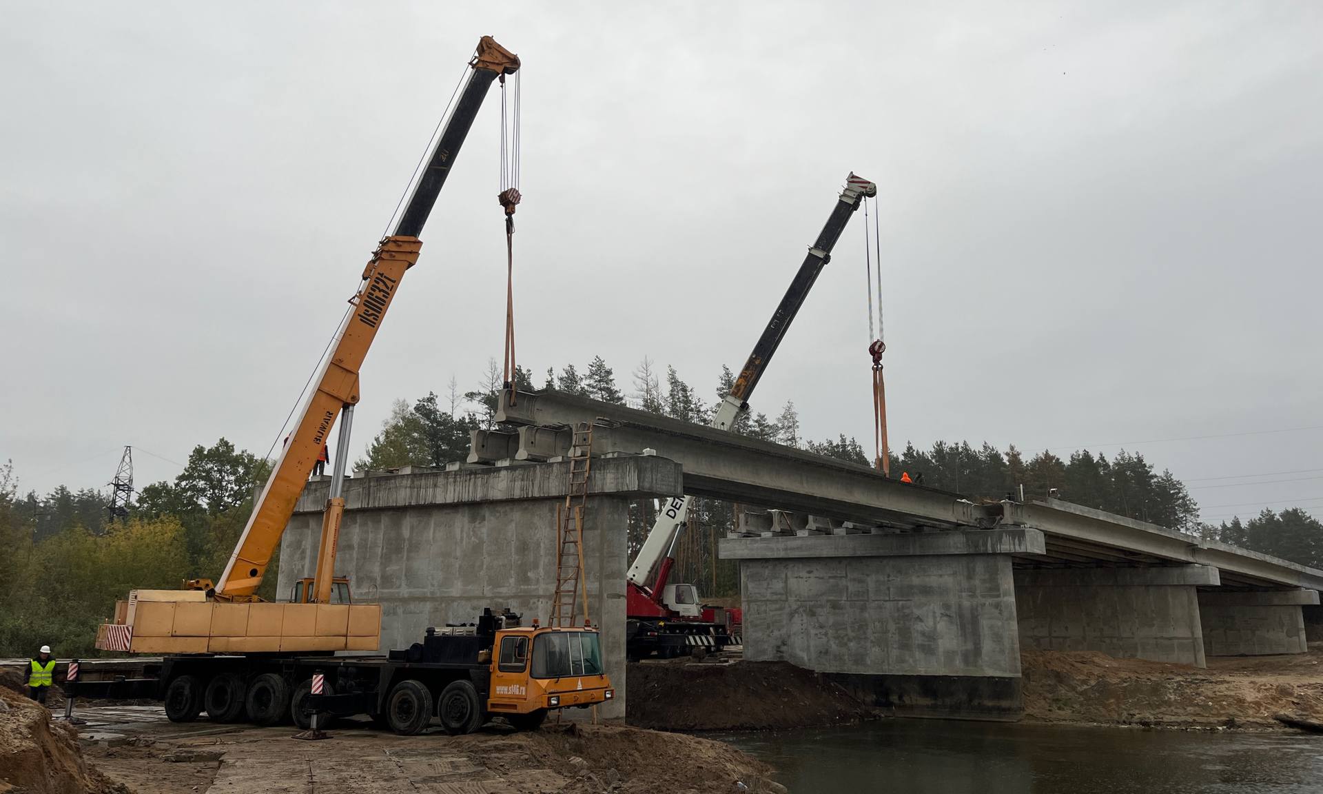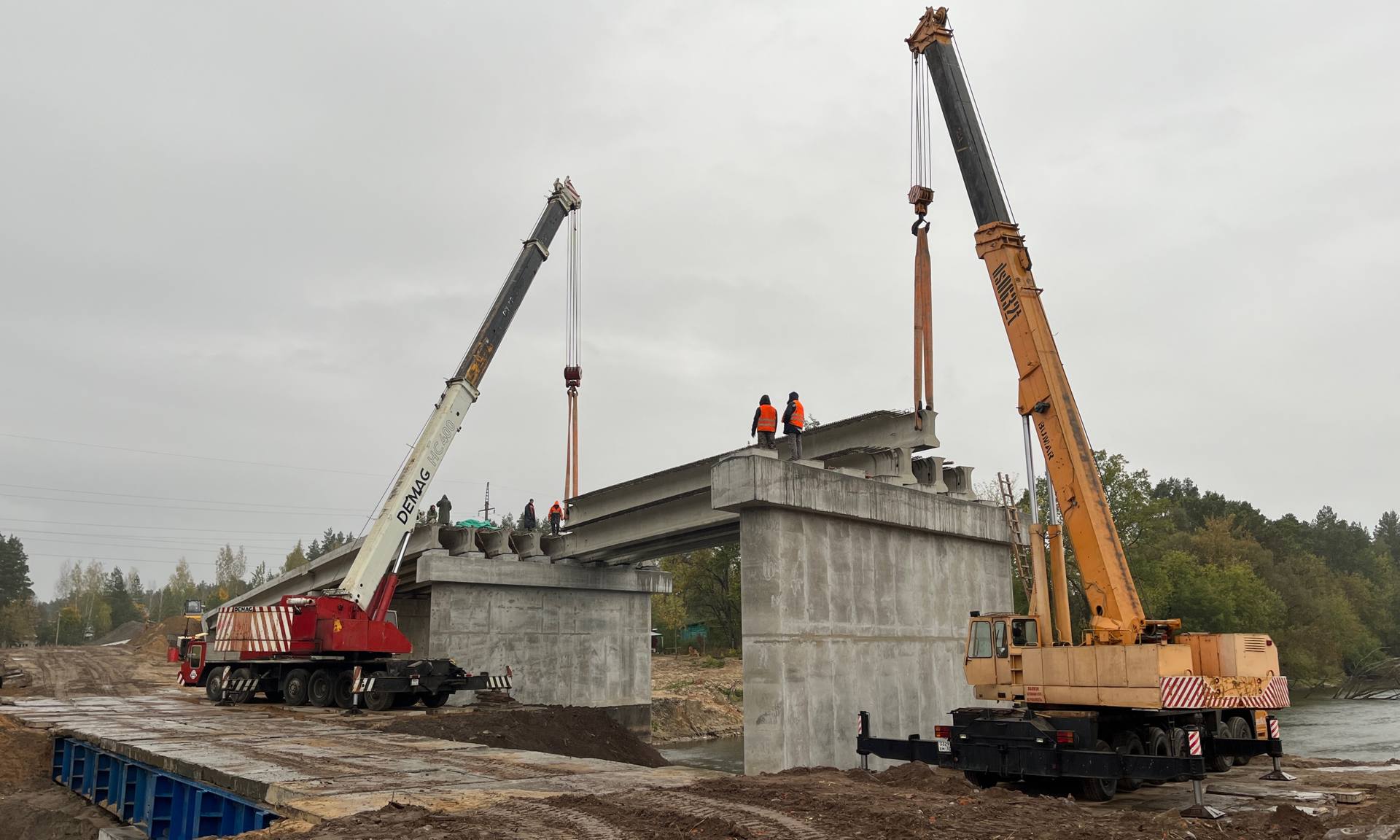 Протяженность моста из шести опор и пяти пролетов — 120 метров. Три пролета уже готовы к асфальтированию, строители укладывают балки на четвертом пролете. Новый мост со старым соединяет дорога, которая тоже будет отремонтирована.