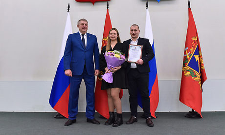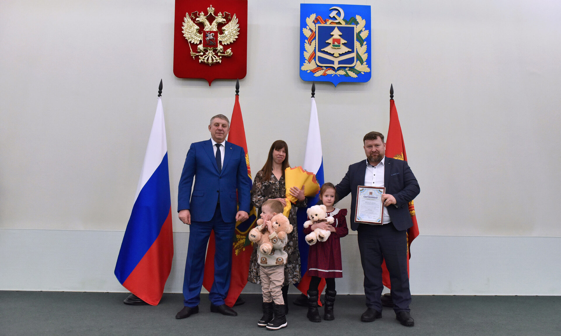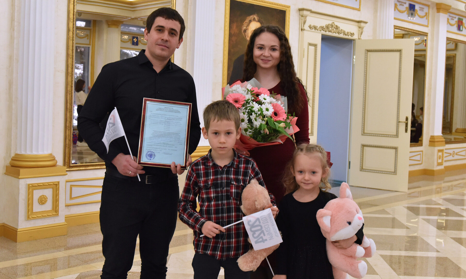 Чествование семей области началось с семьи Иванюшиных, которой Александр Богомаз вручил сертификат на областной материнский капитал. У Дарьи и Владислава Иванюшных накануне 2024 года родились трое сыновей — Матвей, Артем и Арсений. Рождение тройни — это достаточно редкое событие. Символично, что оно случилось накануне Года семьи.