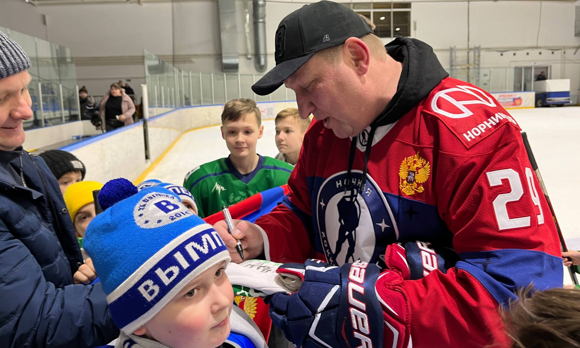 Хоккейный праздник завершился общим фотографированием и автограф-сессией прославленных спортсменов Сергея Макарова и Бориса Миронова.