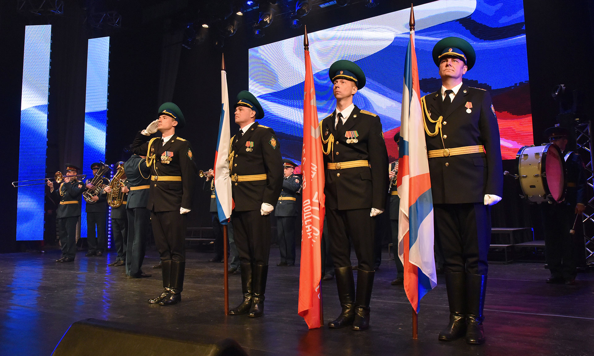 Мероприятие началось с внесения Государственного Флага Российской Федерации, копии знамени Победы и Флага Министерства обороны Российской Федерации под звуки марша Преображенского полка и Гимна Российской Федерации.