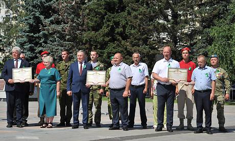 В Суземский муниципальный район грамоту доставили председатель Совета ветеранов войны, труда, вооруженных сил и правоохранительных органов Суземского района Пётр Челобитченков, гвардии сержант разведки, участник СВО Вячеслав Ковалёв и командир отряда «Барс» военно-патриотического клуба «Юные друзья пограничников», ученица 9 класса Алешковичской средней общеобразовательной школы Вера Романенкова.