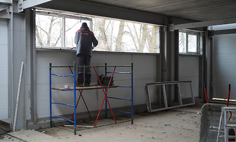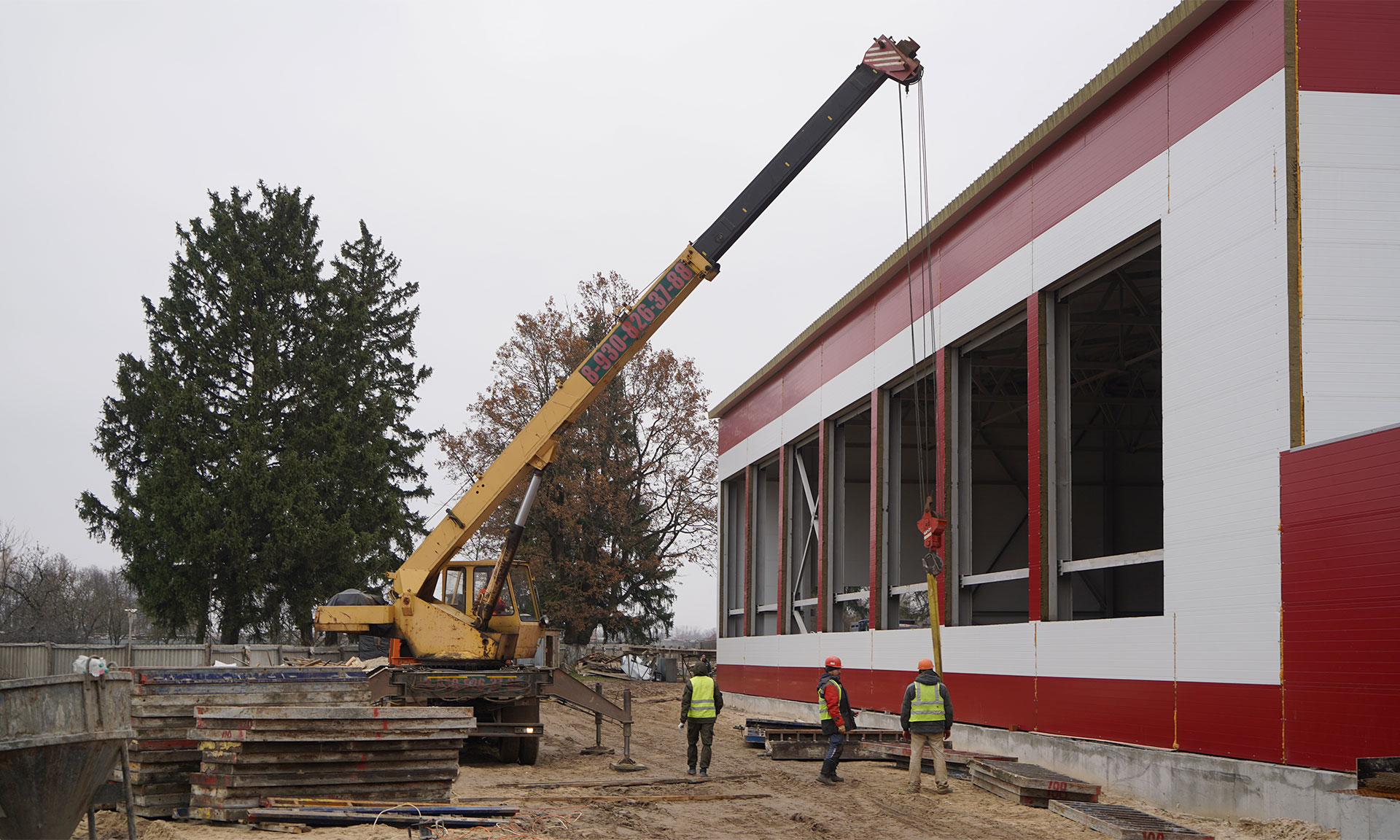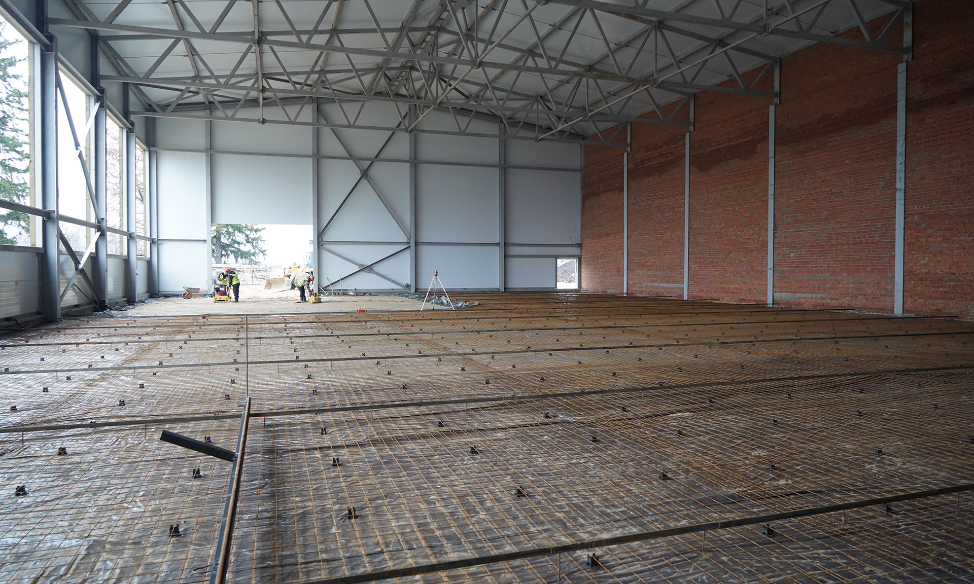 Готовность спорткомплекса — более 50%: возведено само здание, завершены работы с кровлей, выложены межкомнатные перегородки. Сейчас главная задача — поставить окна и смонтировать котельную, которую должны поставить в декабре, чтобы здание было обеспечено теплом и можно было вести отделочные работы.