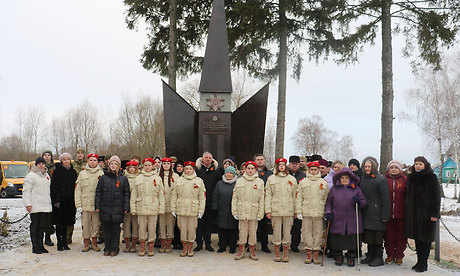 Открыли памятник племянница Героя Советского Союза, уроженца деревни Крюков Николая Захаровича Нешкова Прасковья Королёва и юнармеец Илья Лужков.