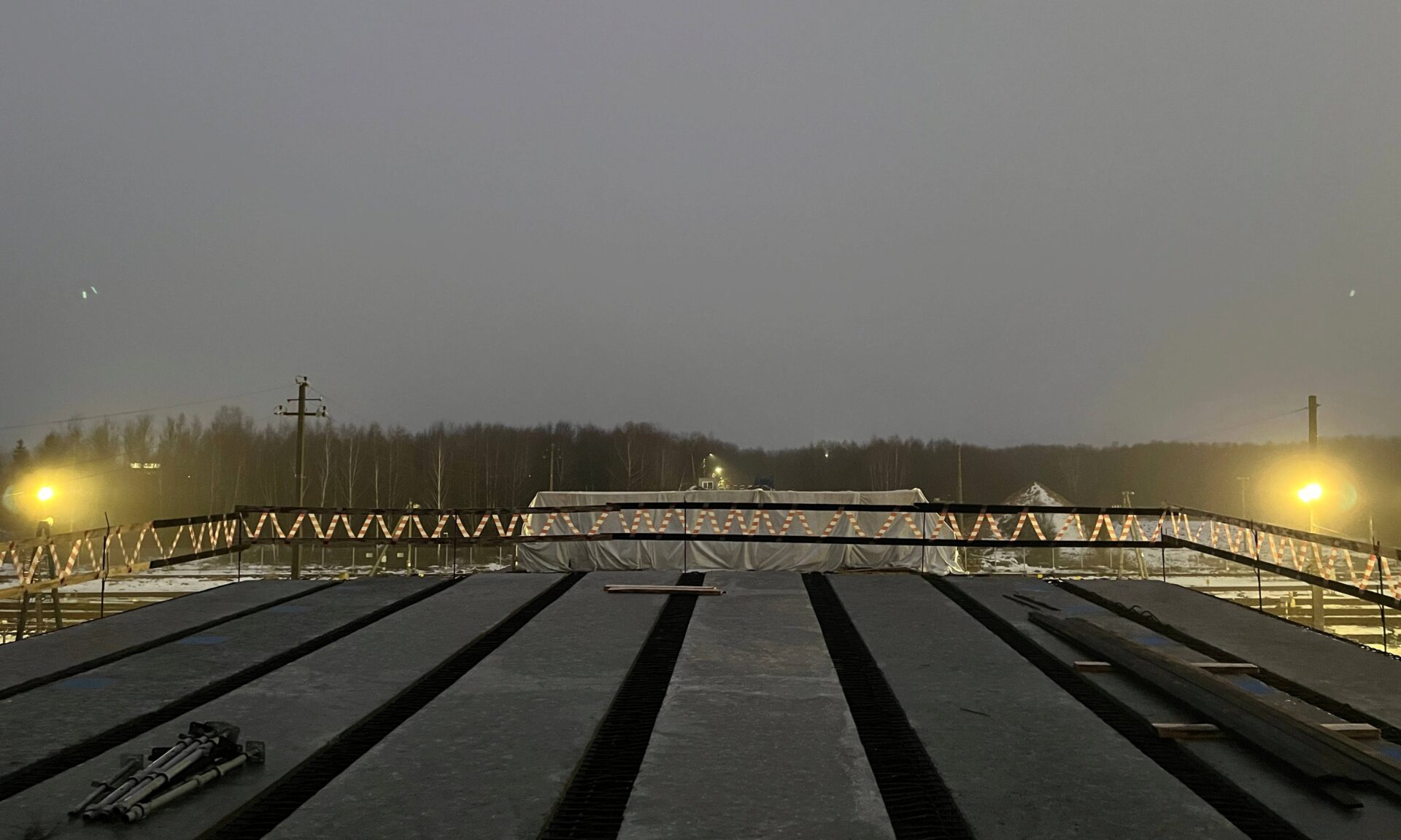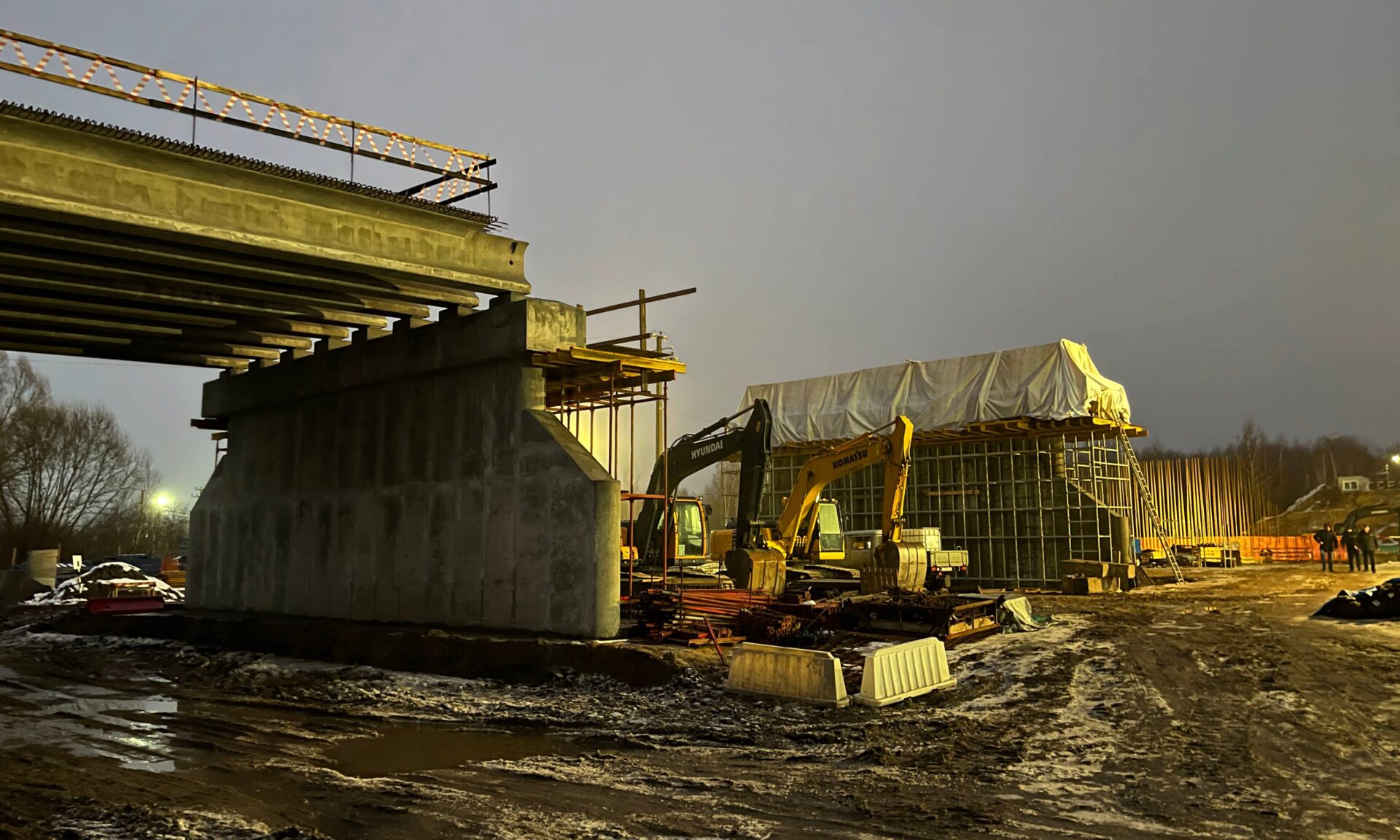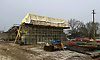 Работы идут в хорошем темпе, по графику, продолжатся и в праздничные дни. Строители полностью демонтировали старый мост, возвели четыре новые опоры из восьми, смонтировано два пролета, сделан временный технический переезд.
