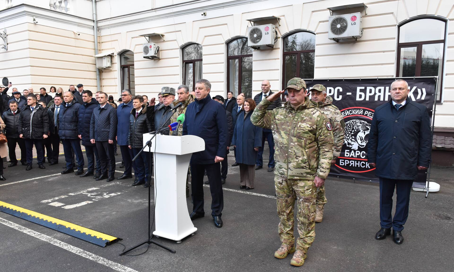 Глава региона передал командиру «БАРС-Брянск» Сергею Антошину ключи от трёх новых автомобилей УАЗ и сертификат на 5 дизельных генераторов и 100 радиостанций.