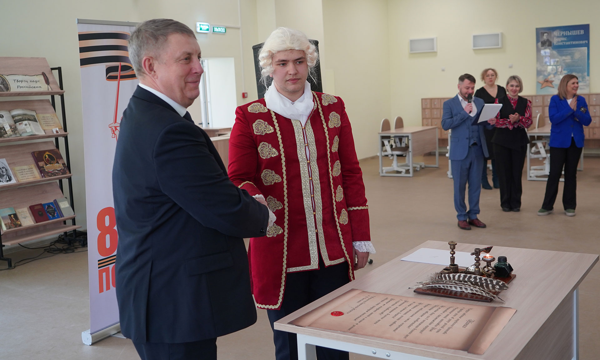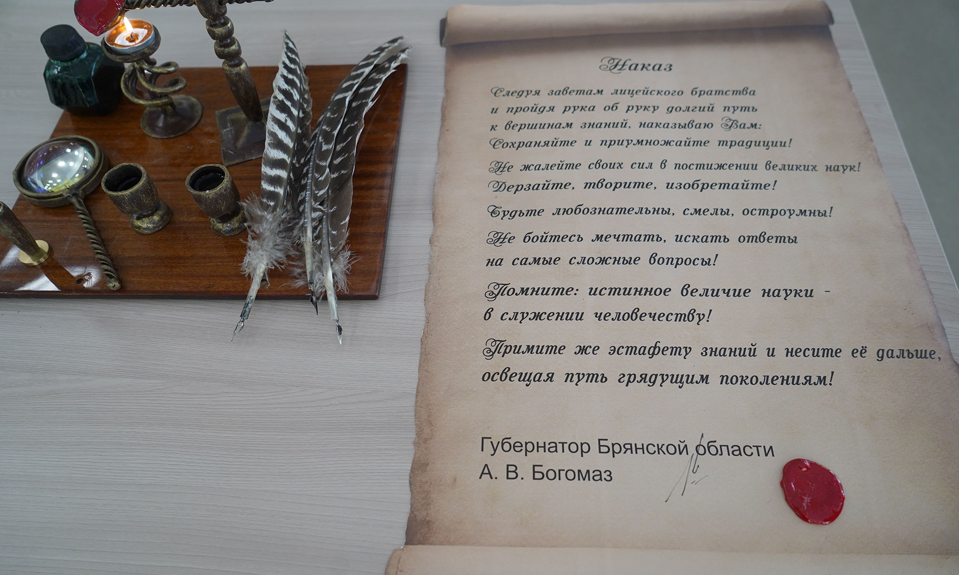 Руководитель ООО «Стройдело», заслуженный строитель Российской Федерации Михаил Кабанов вручил символический ключ директору лицея № 2 города Брянска Александру Напреенко. Затем Губернатор Александр Богомаз с пожеланиями лицеистам успешной учебы заверил подписью и печатью символический наказ от Михаила Васильевича Ломоносова.