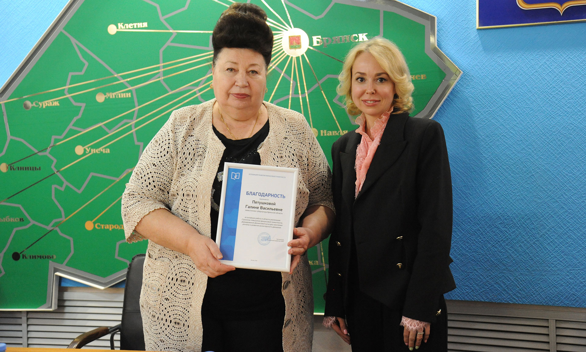 Заместителю Губернатора Галине Петушковой вручена Благодарность Ассоциации развития финансовой грамотности «За активную работу в области реализации Стратегии повышения финансовой грамотности, формирования финансовой культуры населения региона и развития волонтерского движения».