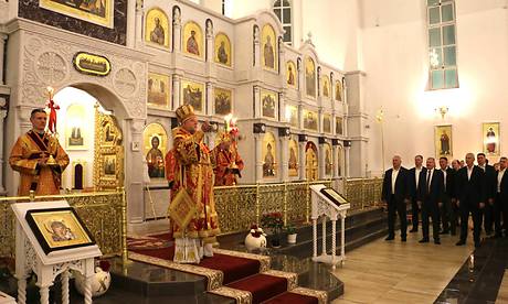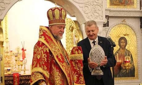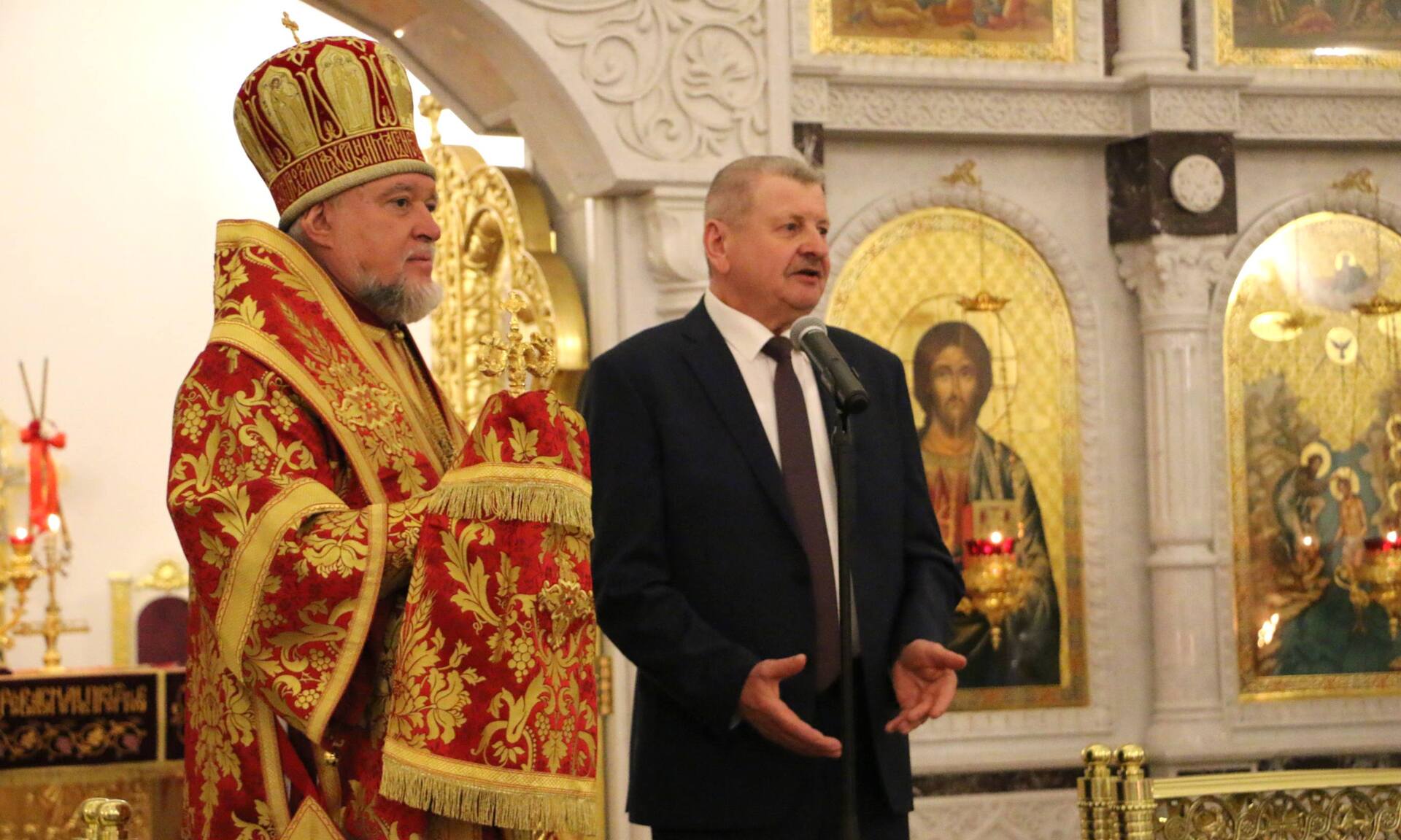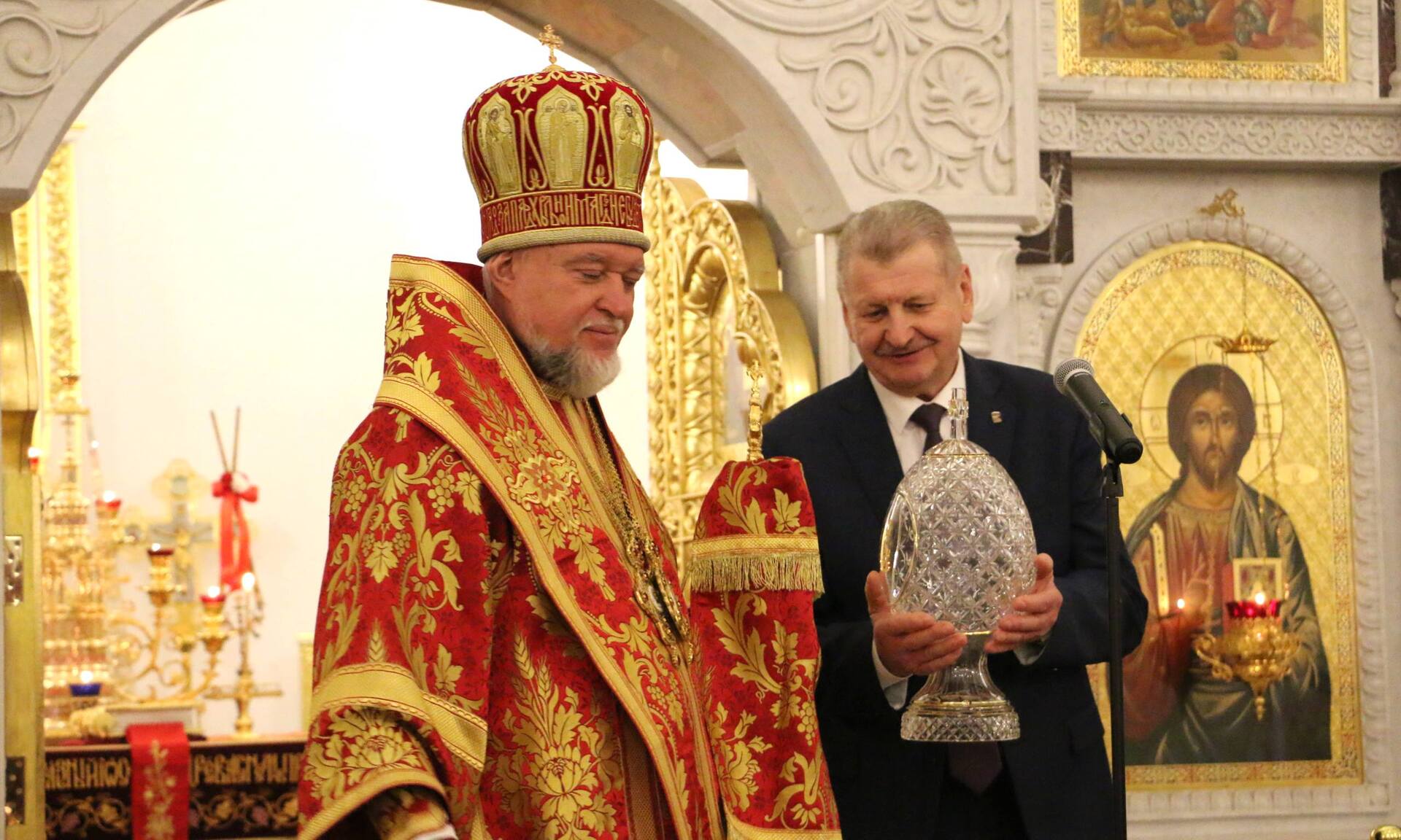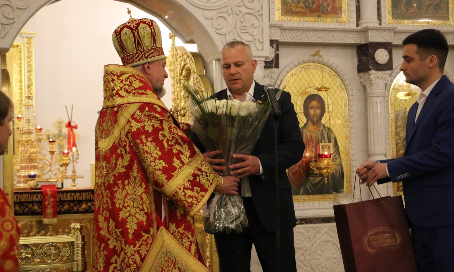Николай Симоненко и Олег Матыцин присоединились к поздравлениям, вручили ответные подарки и белые розы Владыке Владимиру, пожелав здоровья и благополучия ему и всем прихожанам.