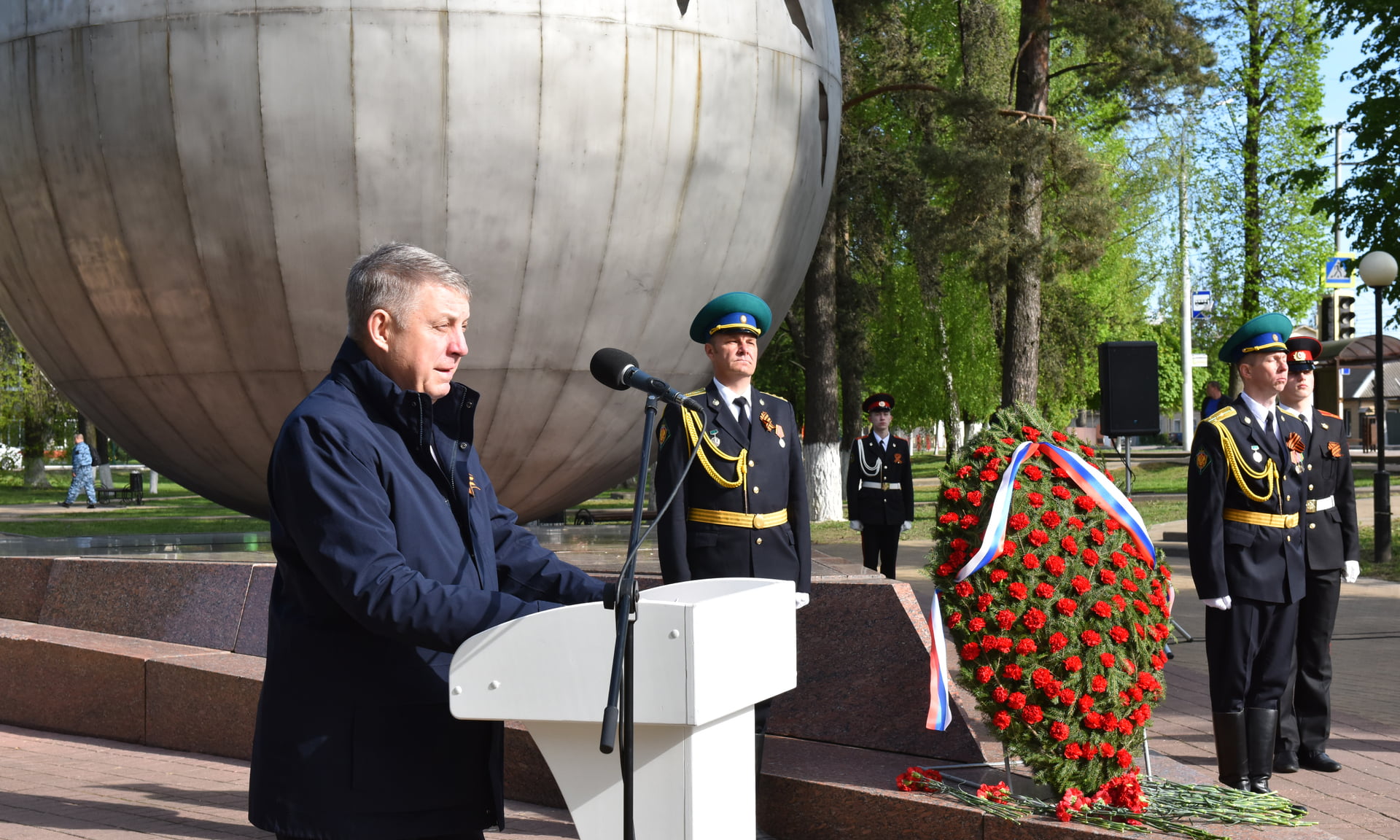 После минуты молчания и прозвучавшего Гимна Российской Федерации к собравшимся обратился глава региона Александр Богомаз: