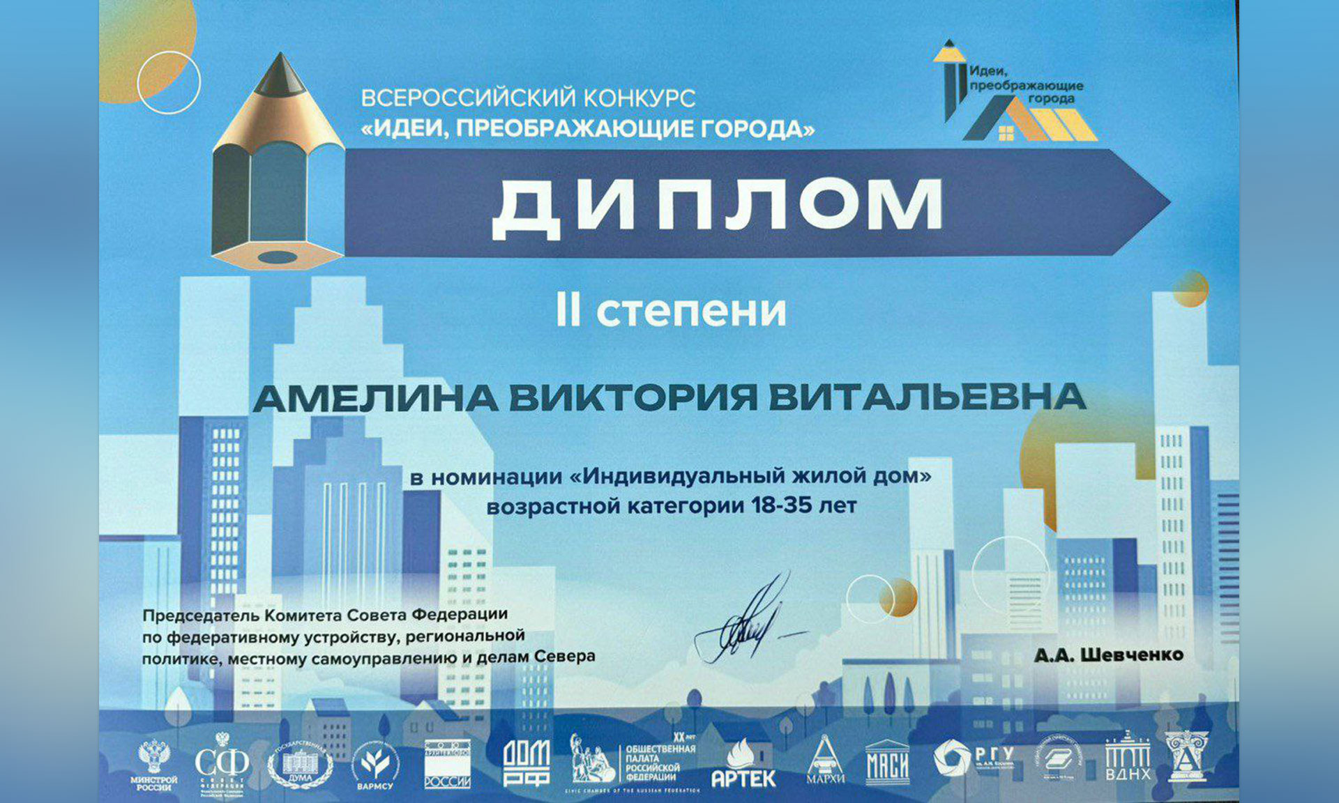 По итогам конкурса жительница Брянской области Виктория Амелина заняла 2 место в номинации «Индивидуальный жилой дом» возрастной категории 18–35 лет со своим проектом «Усадебный жилой дом «Алета».