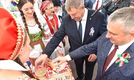 Город мастеров встретил почетных гостей традиционным караваем и 80-метровым славянским пирогом — его испекли брянские и гомельские хлебопеки как символ юбилея Великой Победы, единства и дружбы славянских народов.
