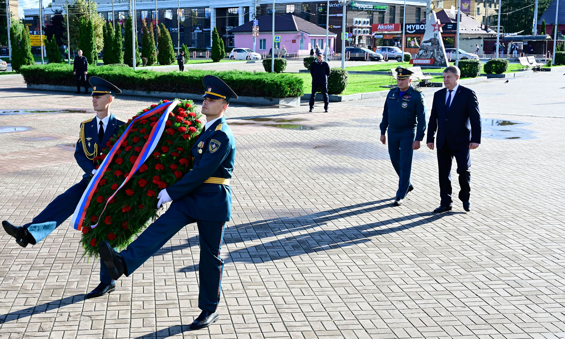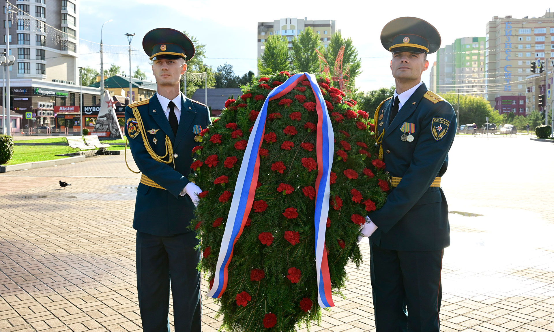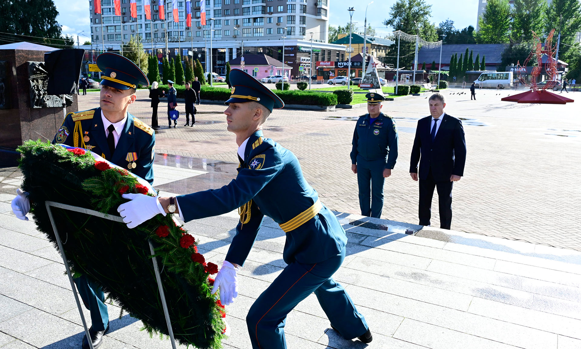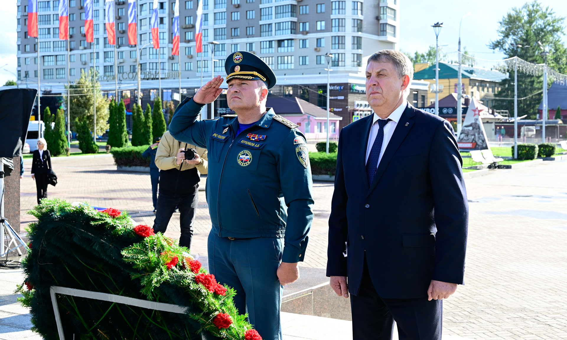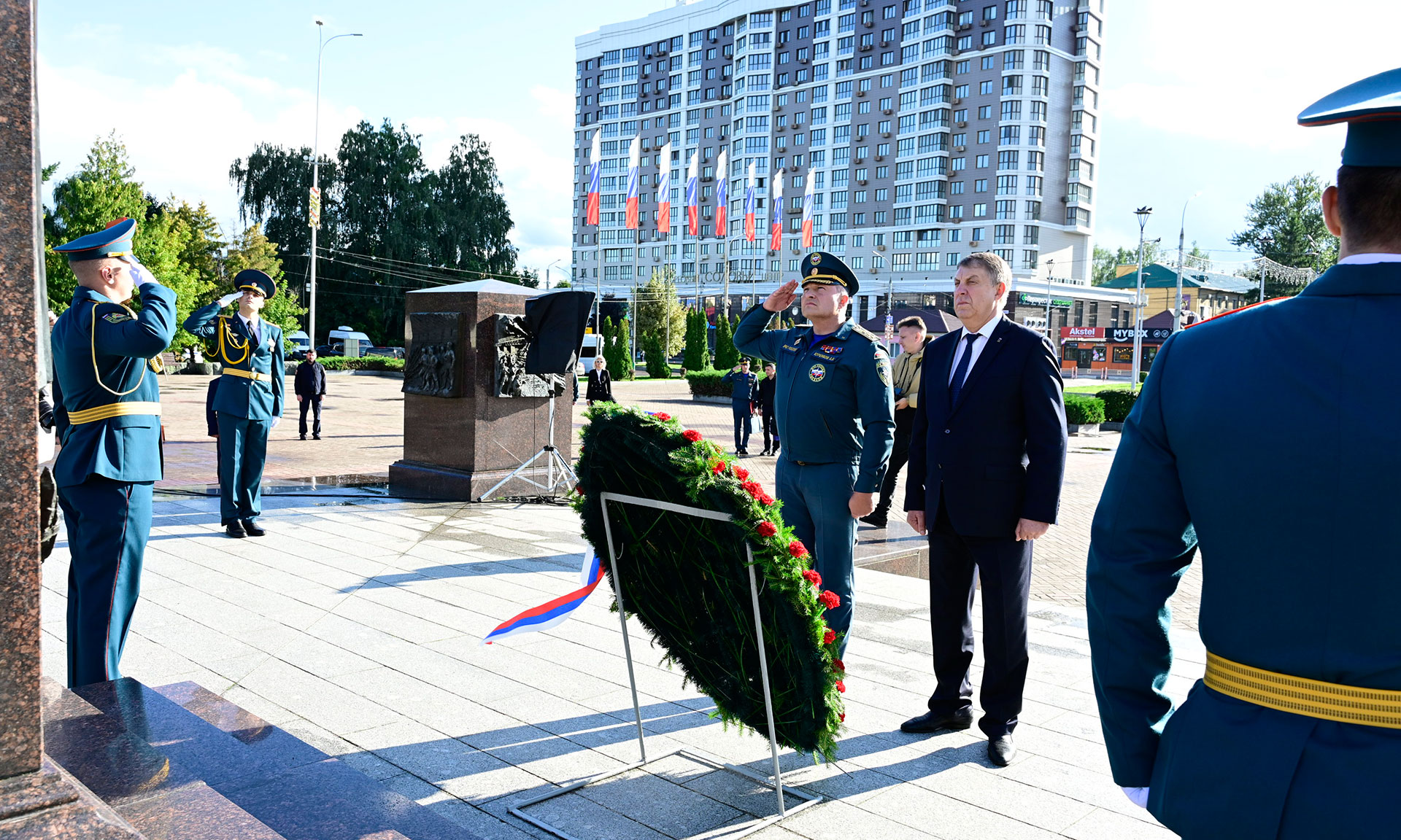 На святом месте для каждого жителя Брянской области Кургане Бессмертия, площади Воинской славы Министр Российской Федерации по делам гражданской обороны, чрезвычайным ситуациям и ликвидации последствий стихийных бедствий Александр Куренков и Губернатор Брянской области Александр Богомаз почтили память Героев, освободивших землю от фашизма.