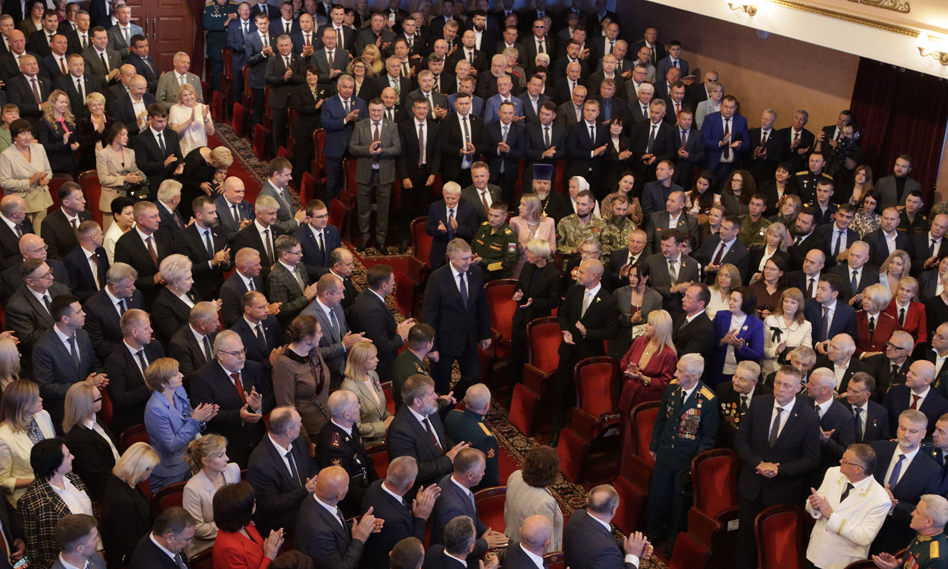 В зал были внесены Конституция Российской Федерации и Устав Брянской области, а также символ Губернаторской власти Брянской области — Знак Губернатора Брянской области.