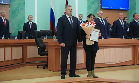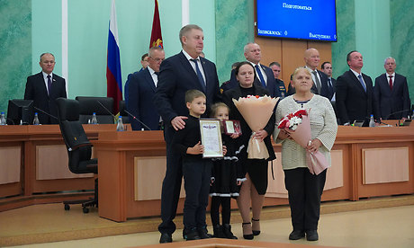 На заседании областной Думы Александр Богомаз вручил родным Героев государственные награды