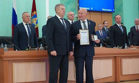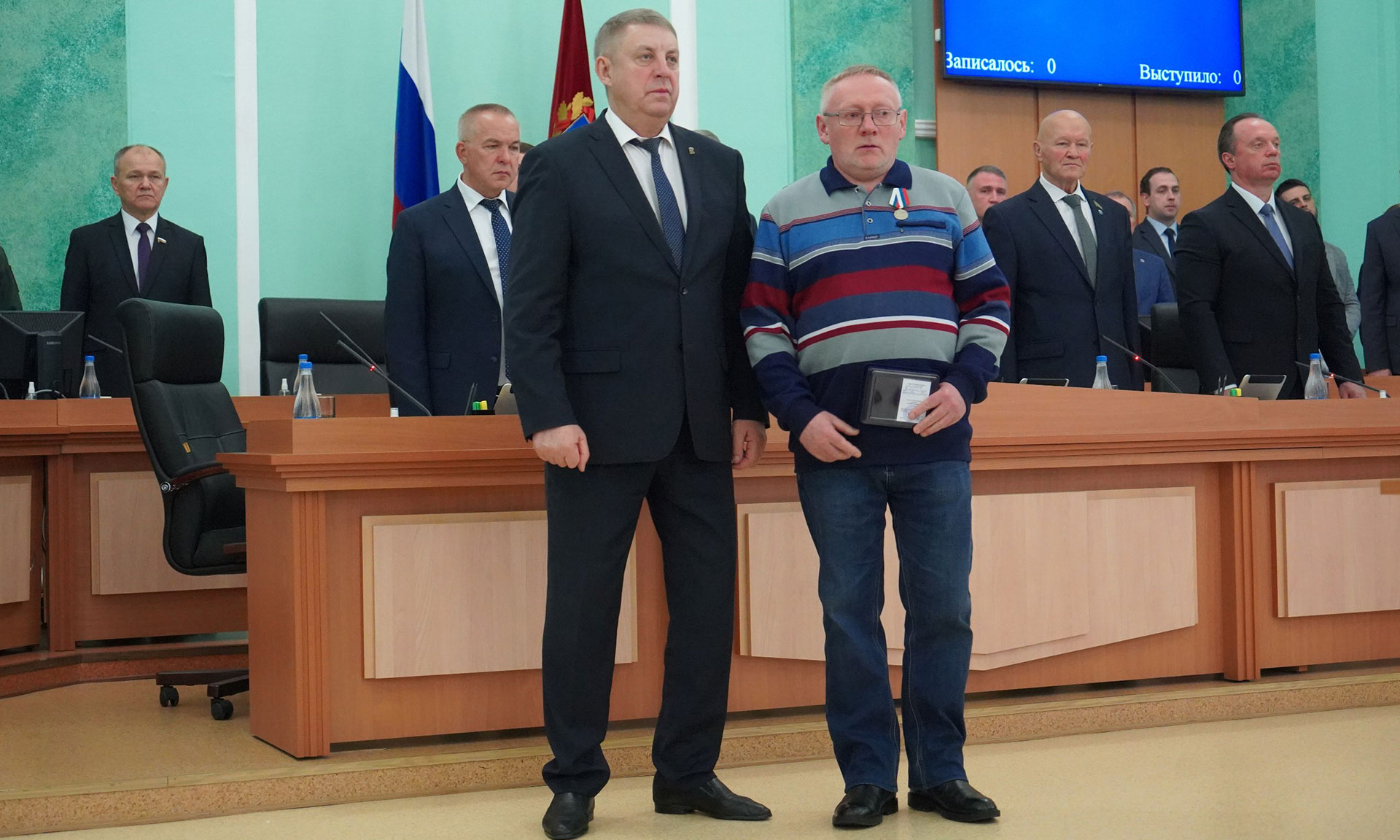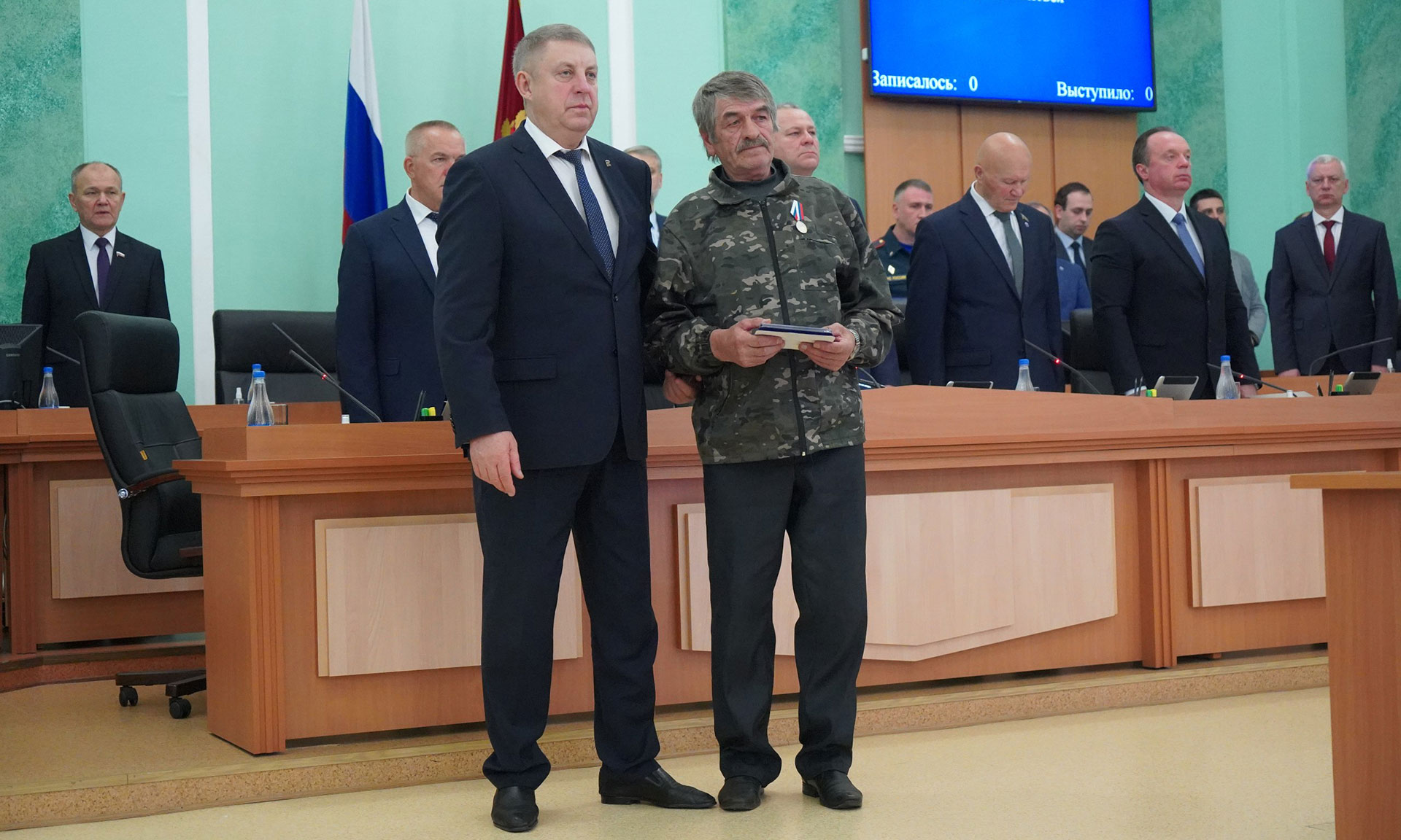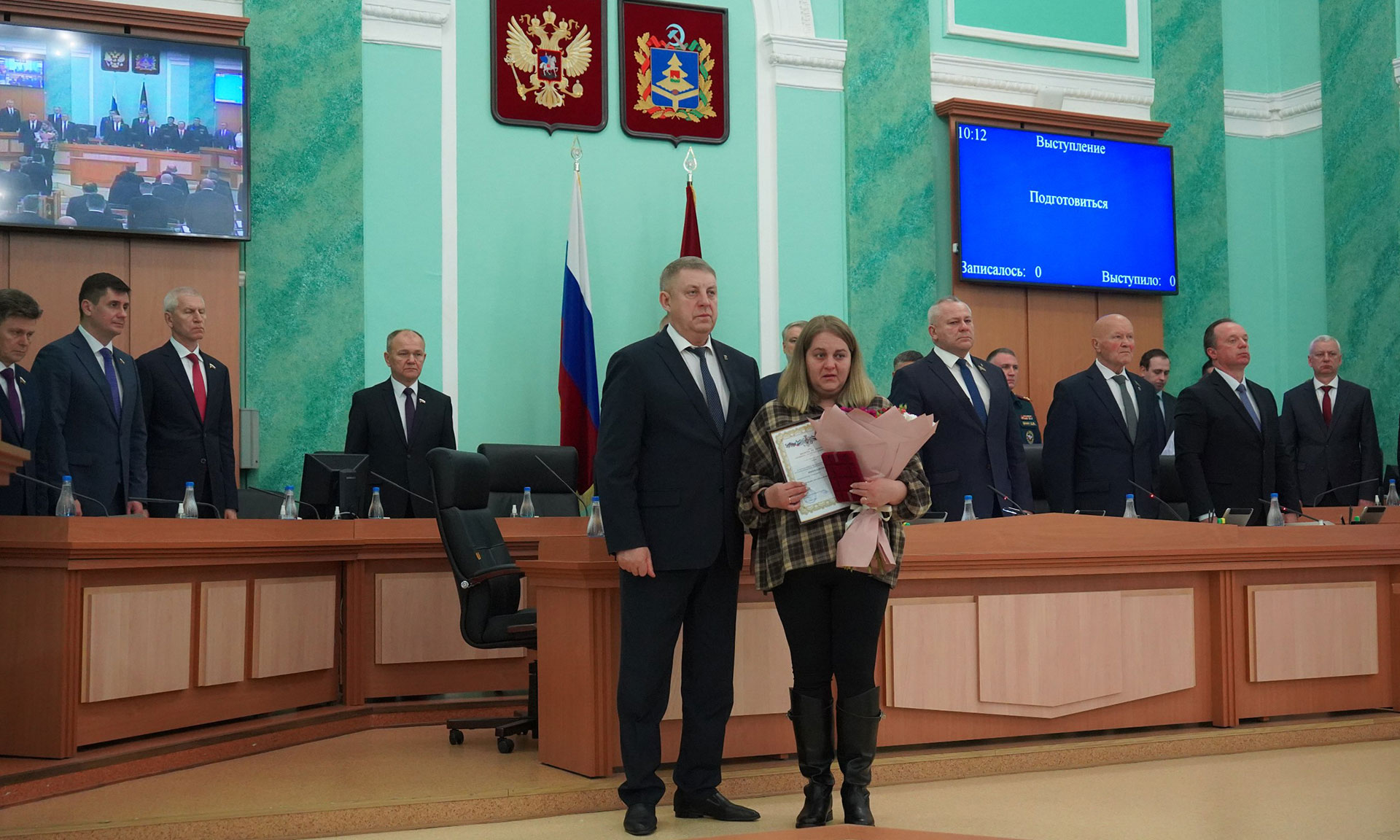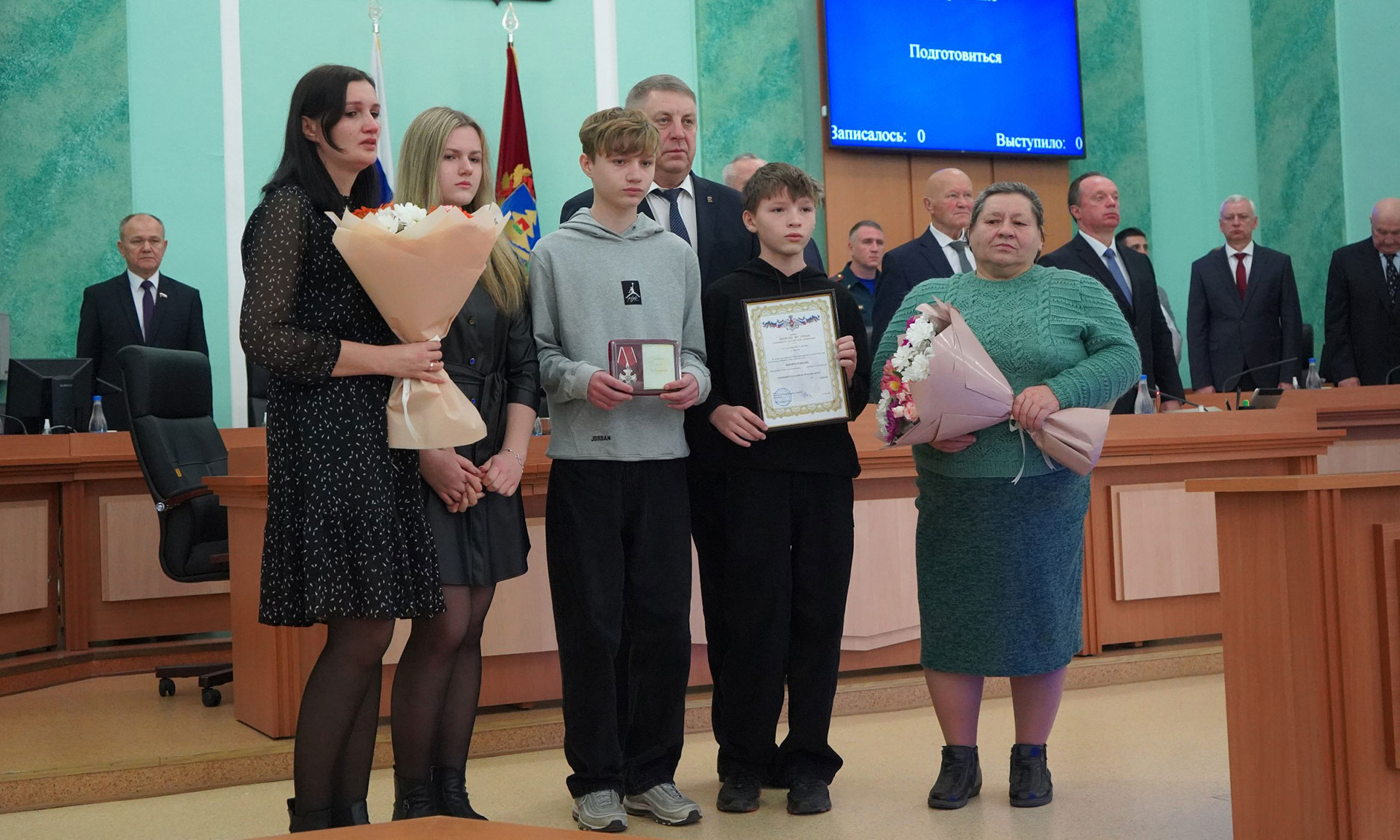 Перед обсуждением основной повестки заседания Александр Богомаз вручил родным Героев государственные награды. За мужество, отвагу и самоотверженность, проявленные при исполнении воинского долга, орденом Мужества посмертно награждены Александр Сергеевич Байдак, Александр Александрович Зубарь, Николай Михайлович Король, Илья Александрович Сиваков, медалью «За храбрость» II степени — Игорь Владимирович Пронин.