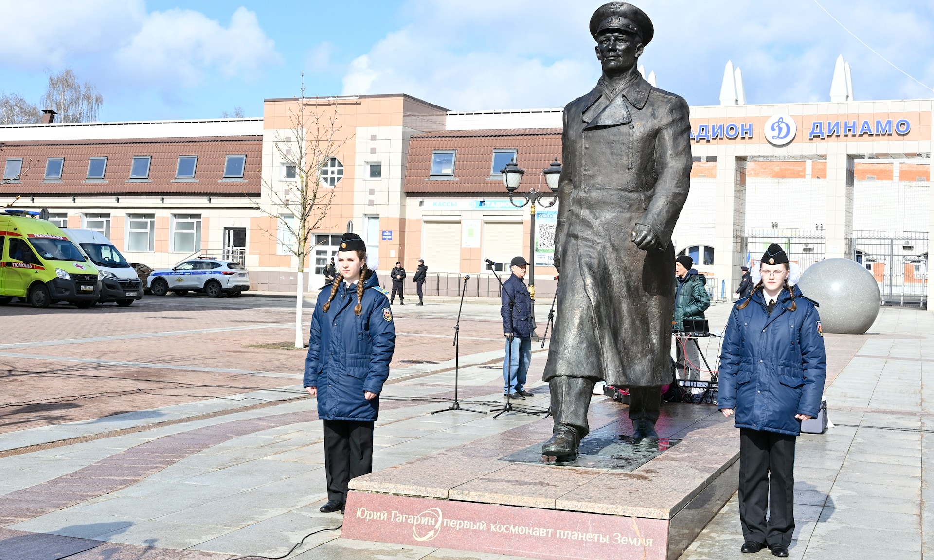 Участники торжественного мероприятия возложили цветы к памятнику первому покорителю космоса, Герою Советского Союза Юрию Алексеевичу Гагарину.